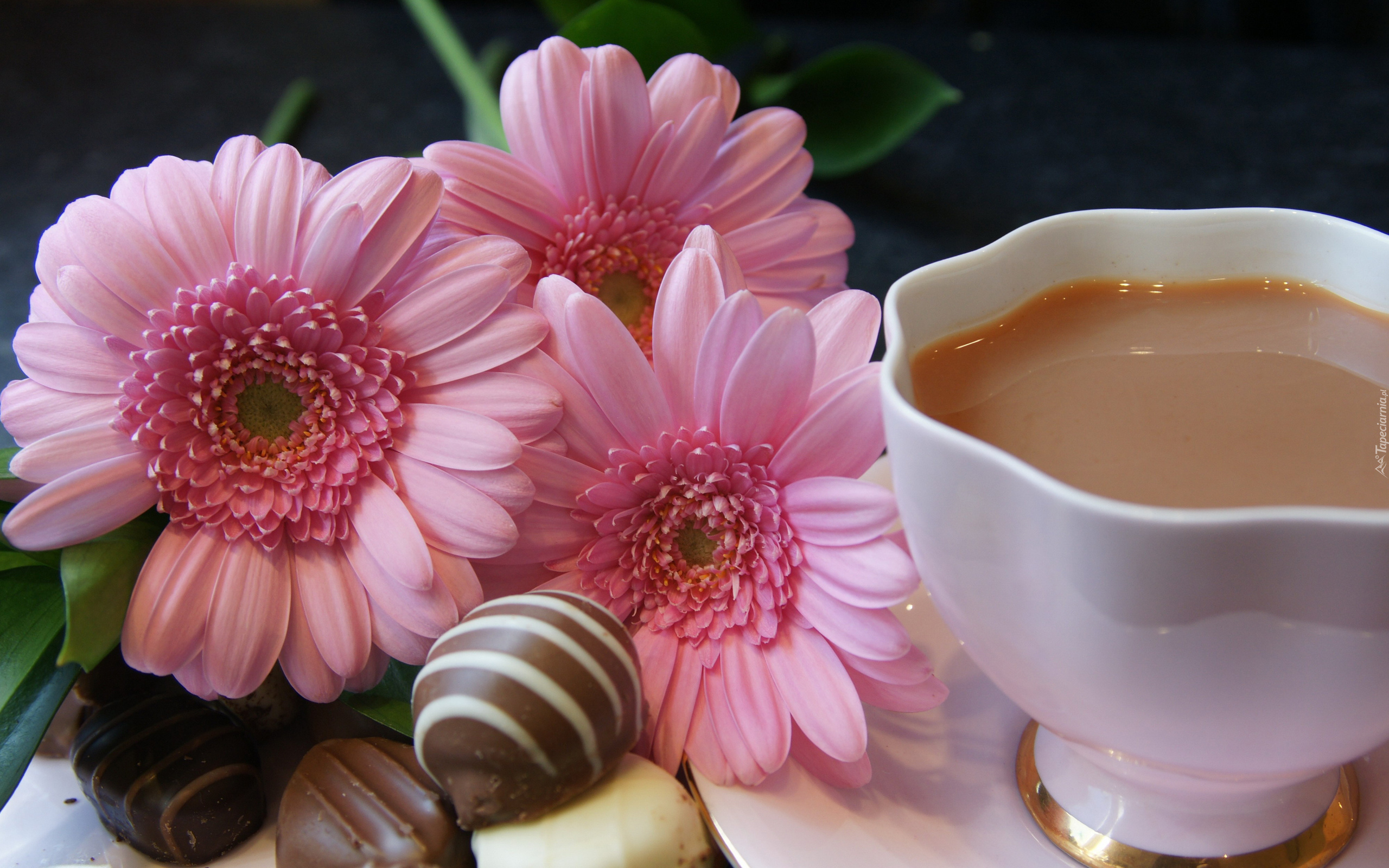 Edytor tapety: Różowe, Gerbery, Filiżanka, Kawa, Czekoladki