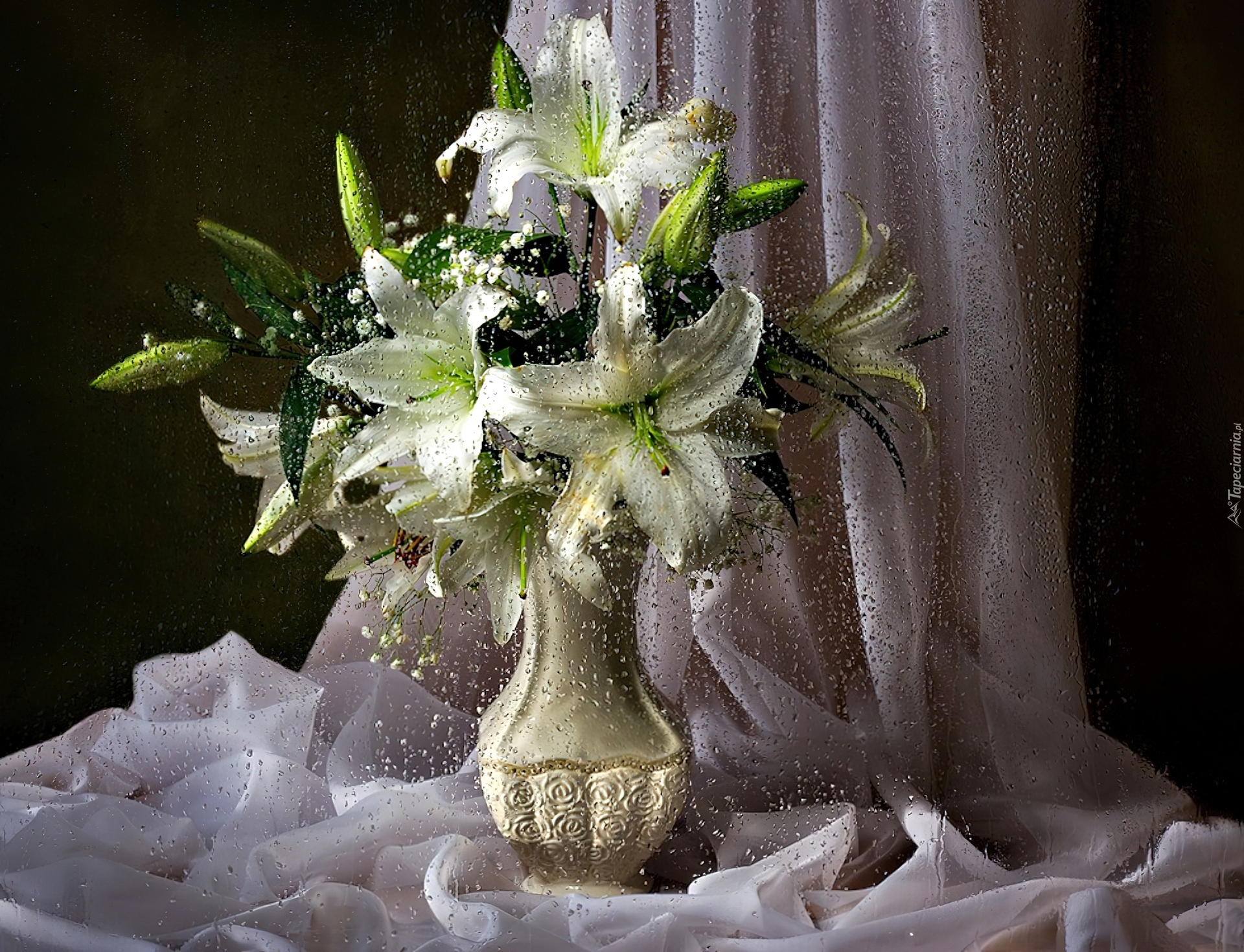 Edytor tapety: Wazon, Białe, Lilie, Krople, Wody, Szal