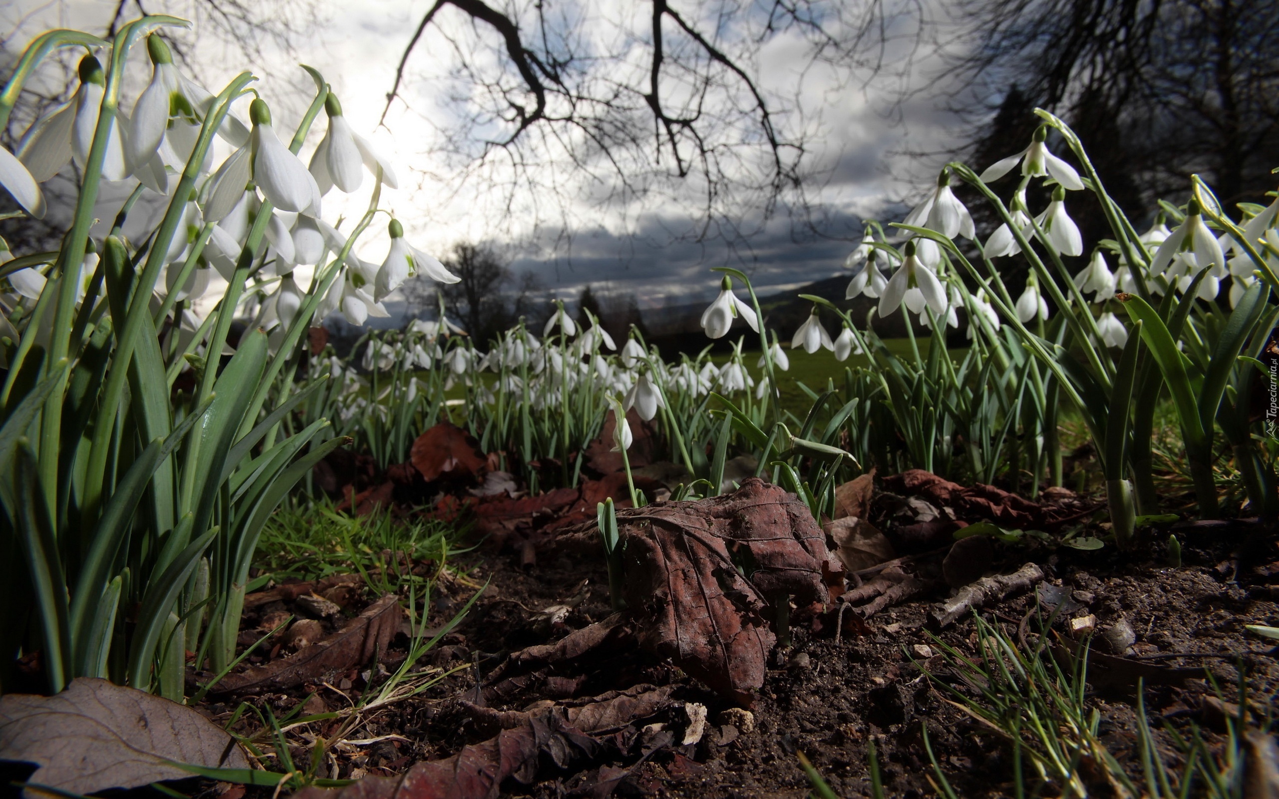 Edytor tapety: Przebiśniegi, Liście, Gałęzie, Niebo