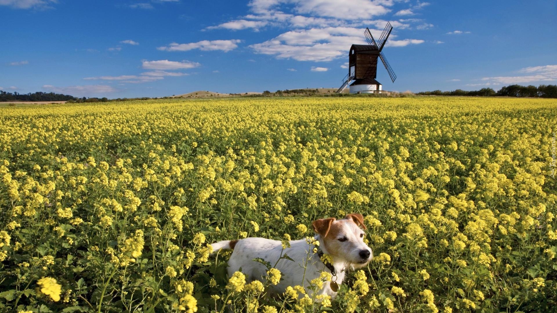 Edytor tapety: Pies, Pole, Rośliny, Wiatrak