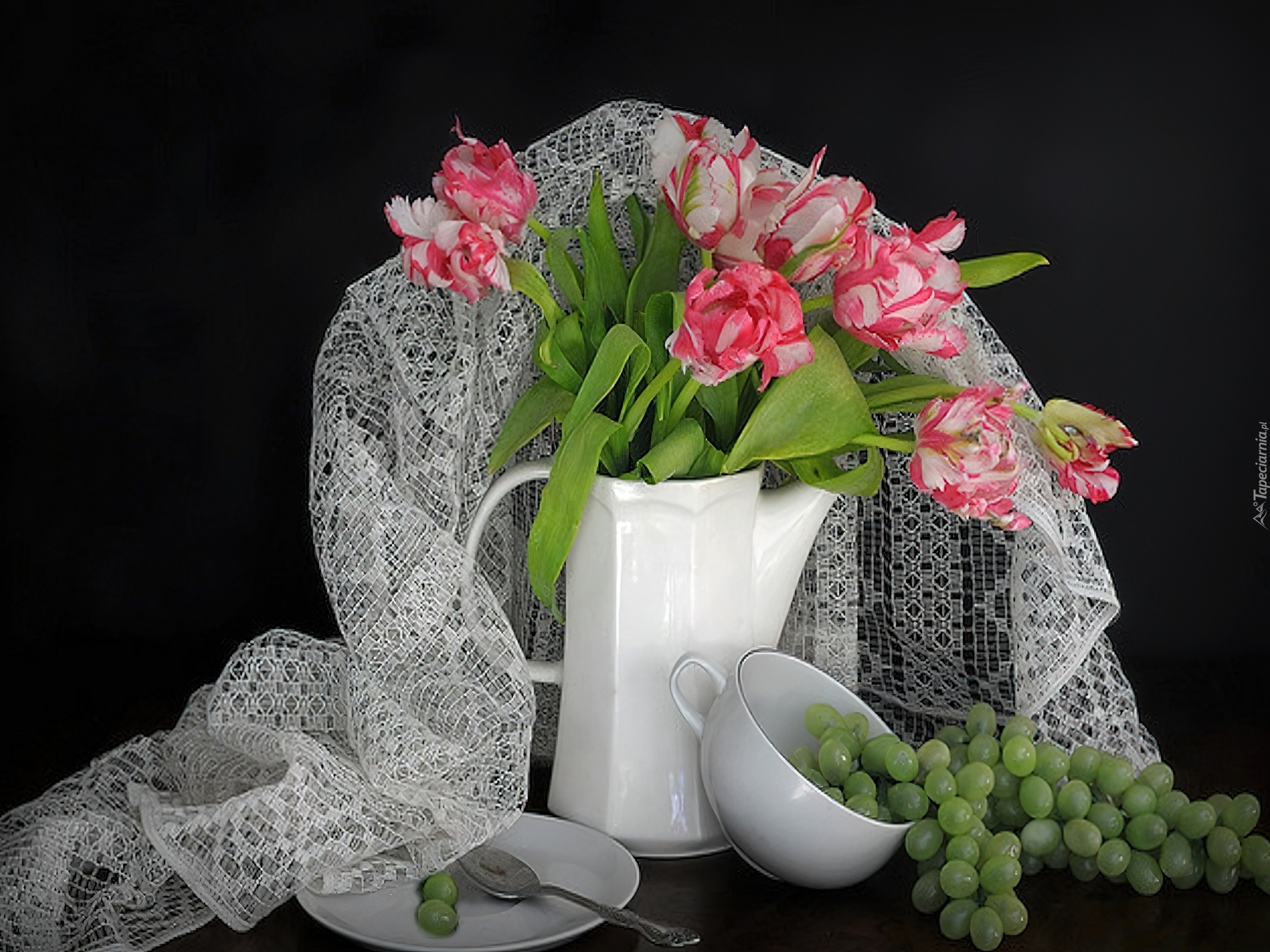 Edytor tapety: Dzbanek, Tulipany, Filiżanka, Winogrona, Koronka