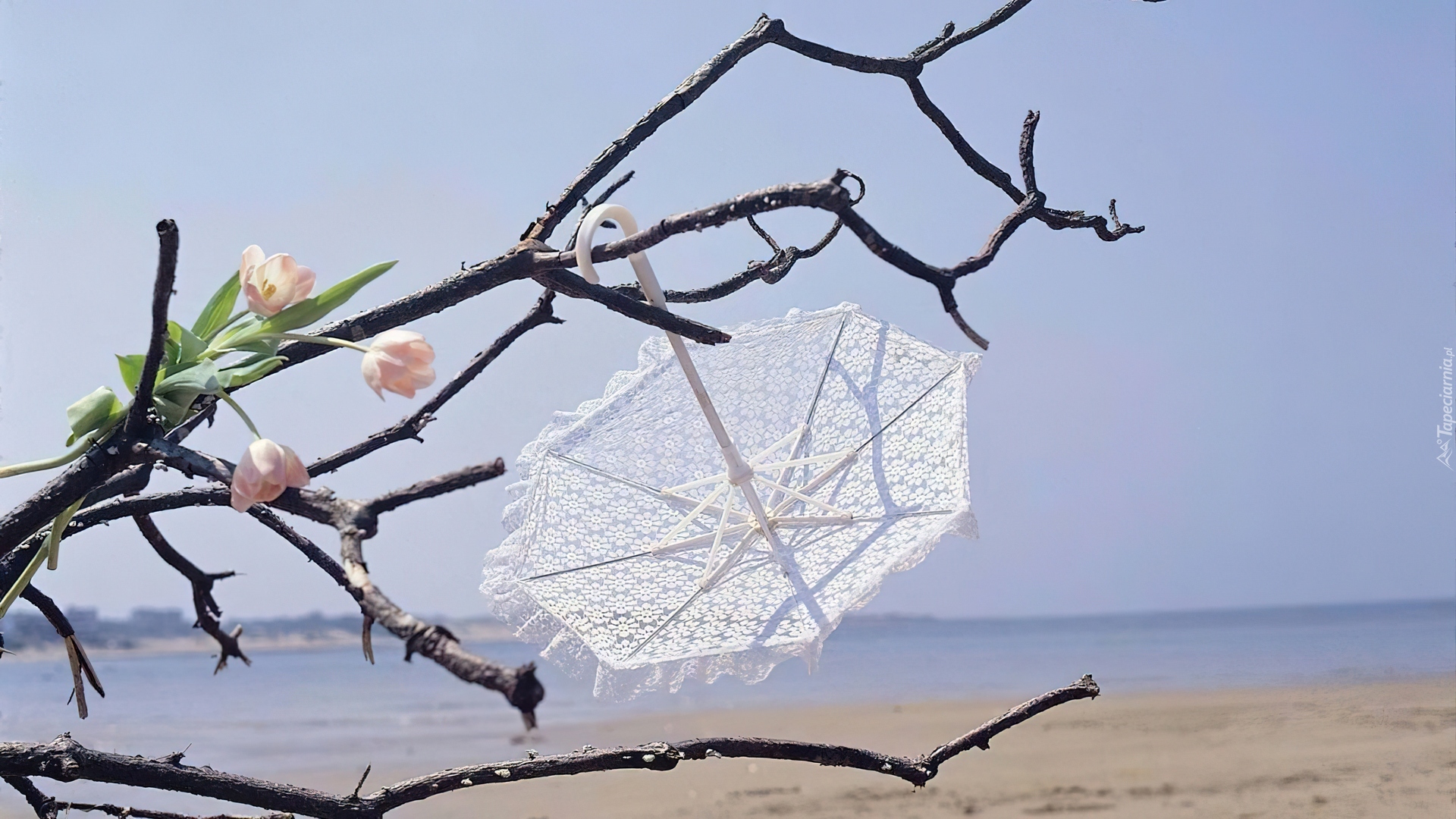 Edytor tapety: Morze, Konary, Tulipany, Parasolka
