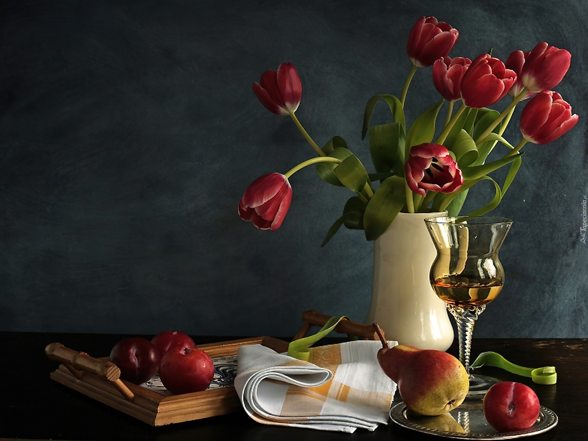 Edytor tapety: Wazon, Tulipany, Owoce, Wino