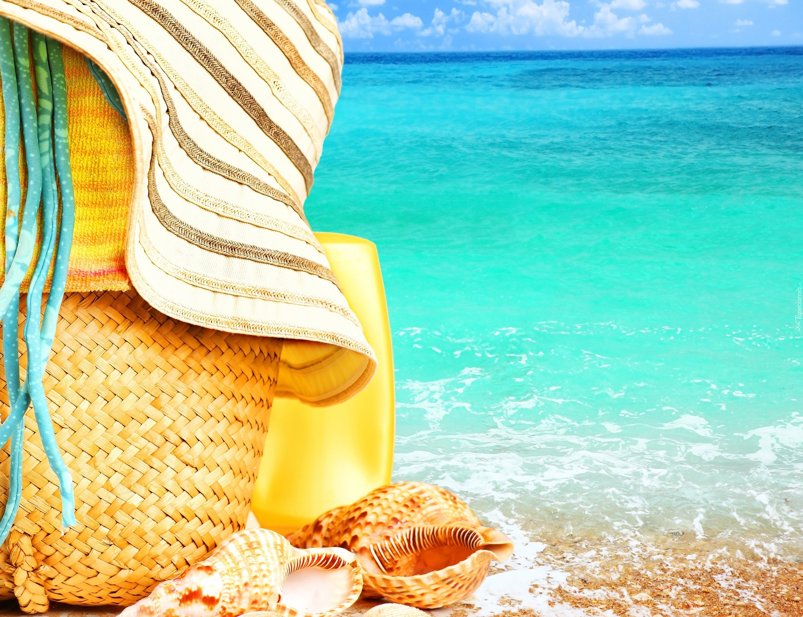 Edytor tapety: Morze, Muszle, Kosz, Kapelusz, Plaża