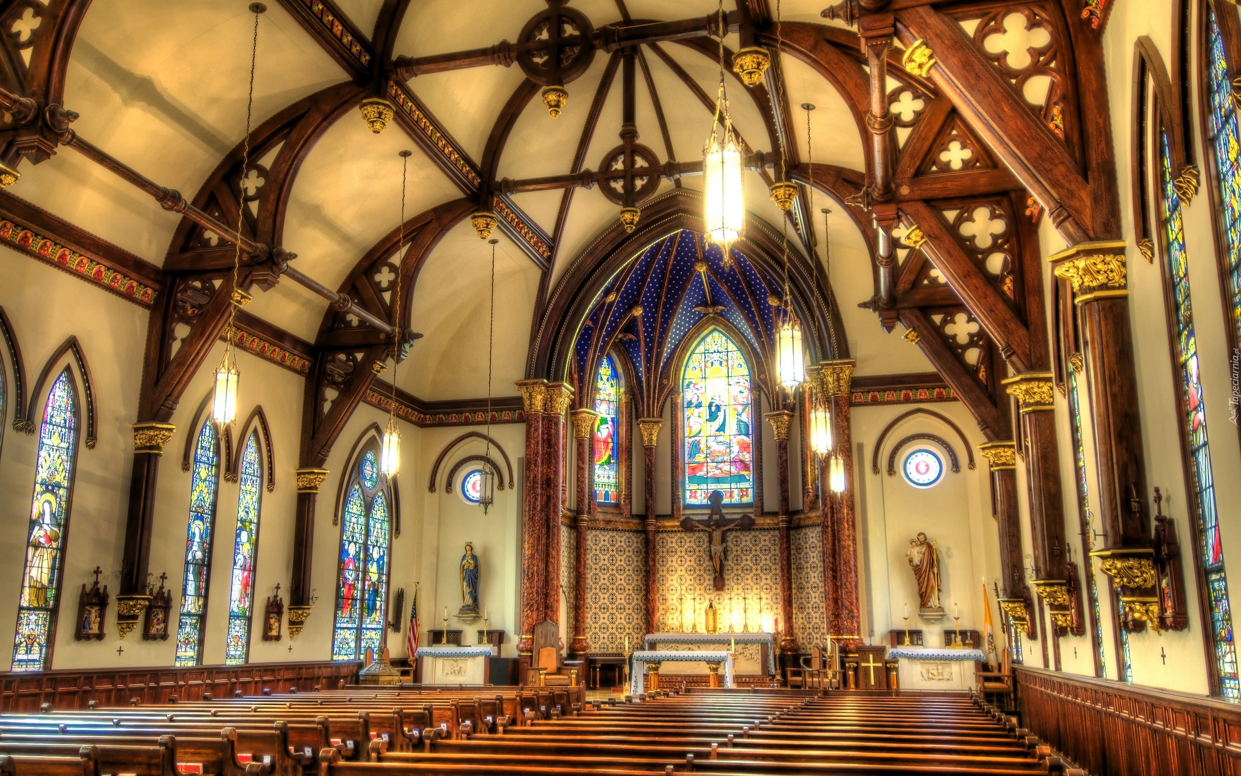 Edytor tapety: Kościół, Ławki, Witraże, Ołtarz, Sklepienie