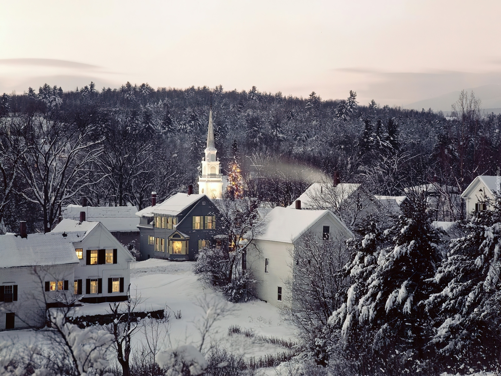 Edytor tapety: Lasy, Zima, Kościół, Budynki