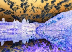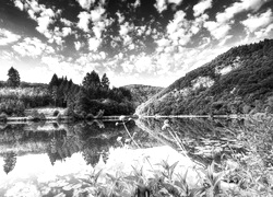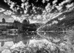 Edytor tapety: Jezioro, Wzgórza, Drzewa, Chmury