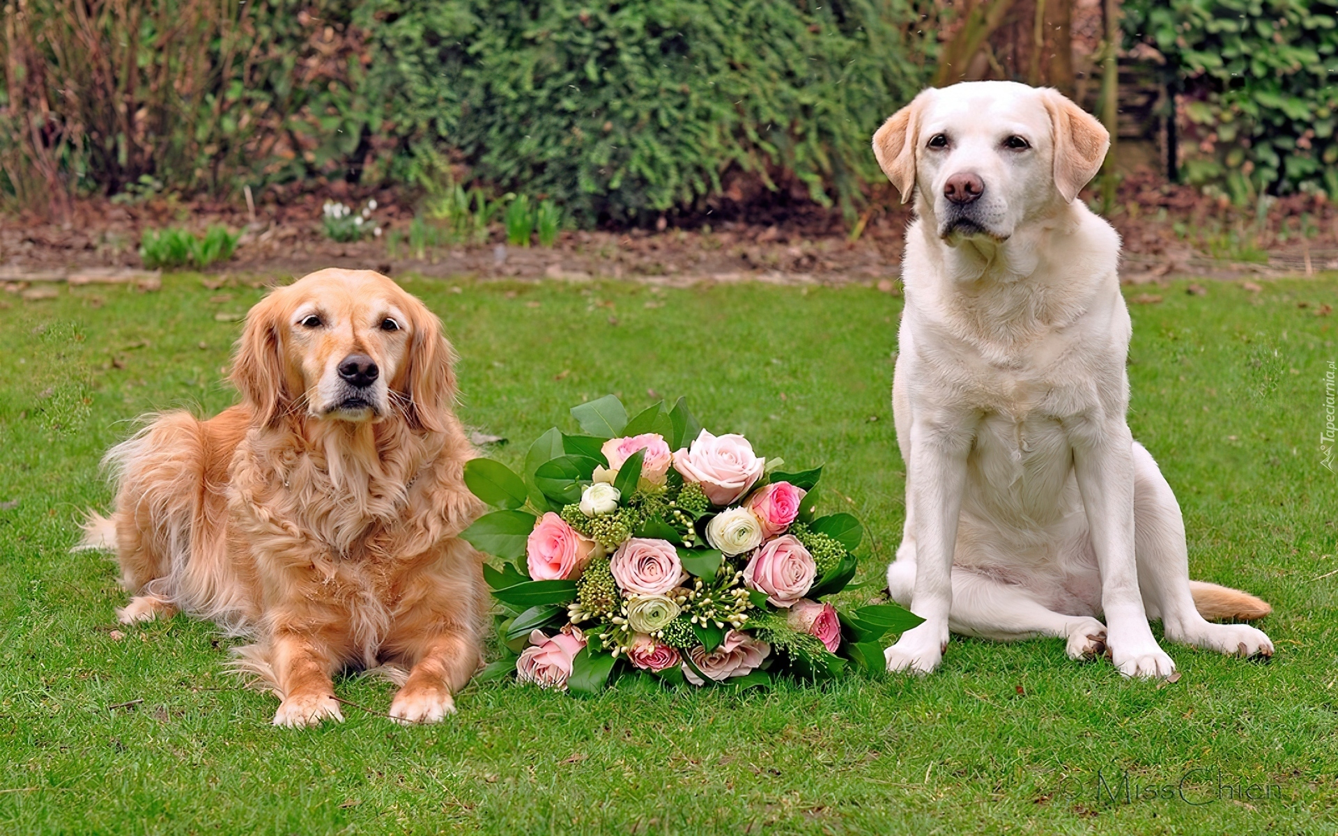 Edytor tapety: Dwa, Psy, Golden retriever, Labrador retriever, Bukiet, Róż