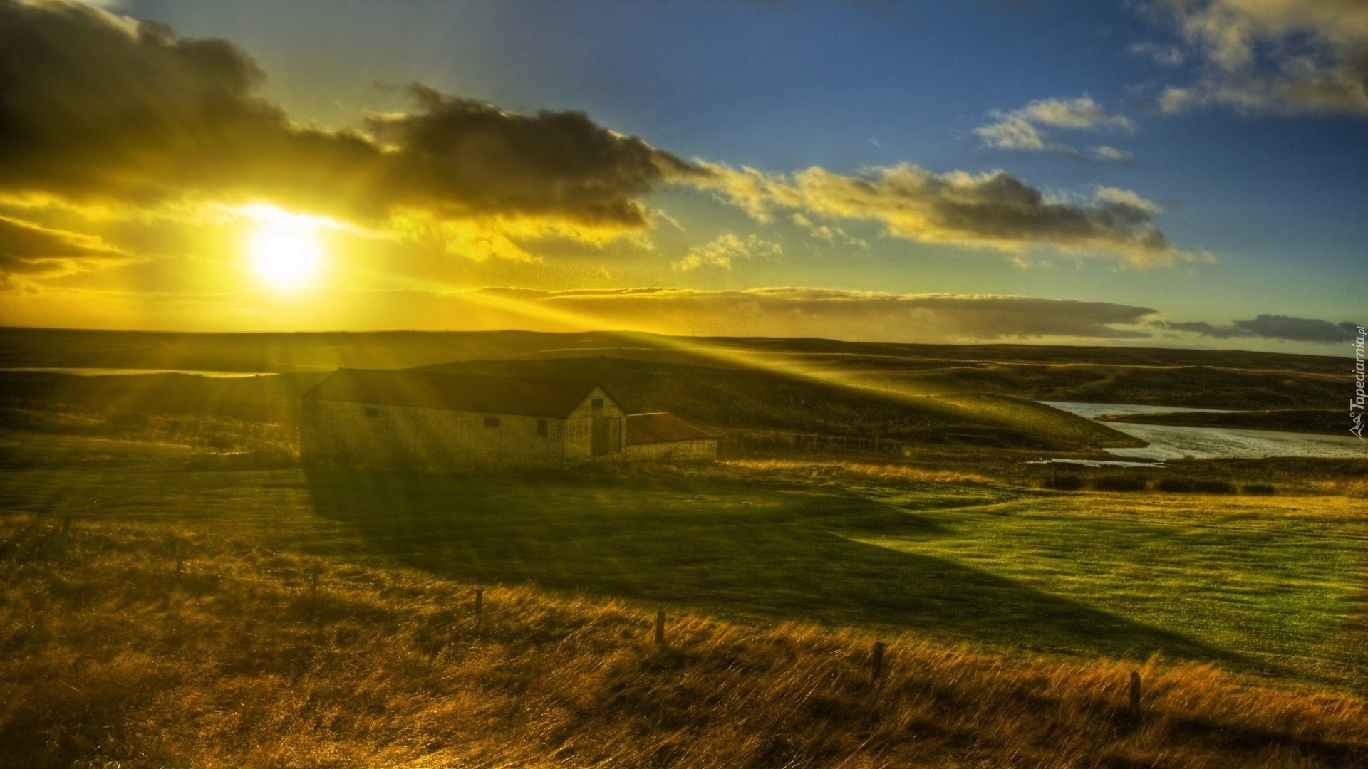 Edytor tapety: Zachód, Słońca, Ferma, Rzeka, Pola