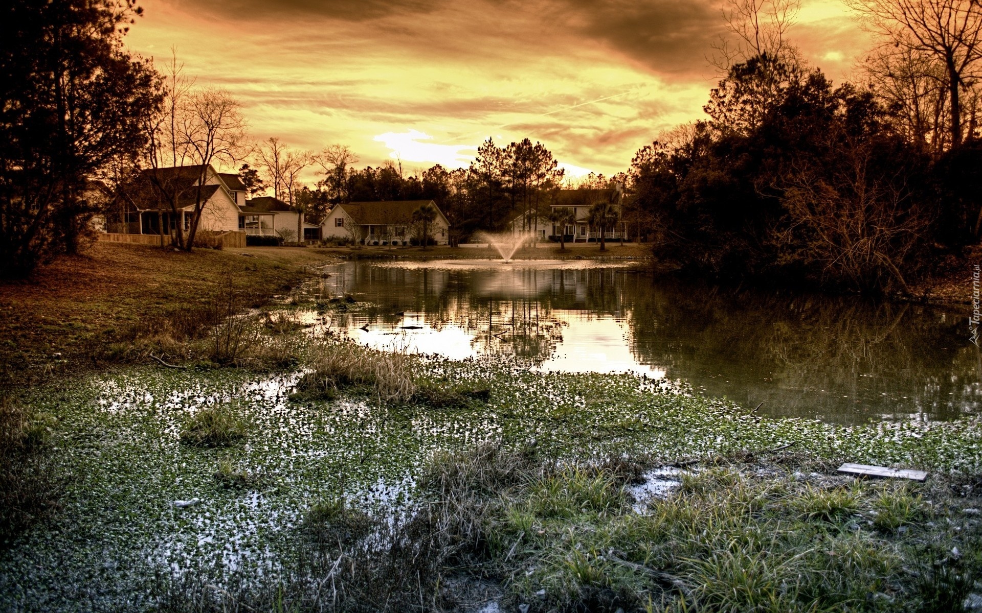 Edytor tapety: Zachód, Słońca, Staw, Budynki
