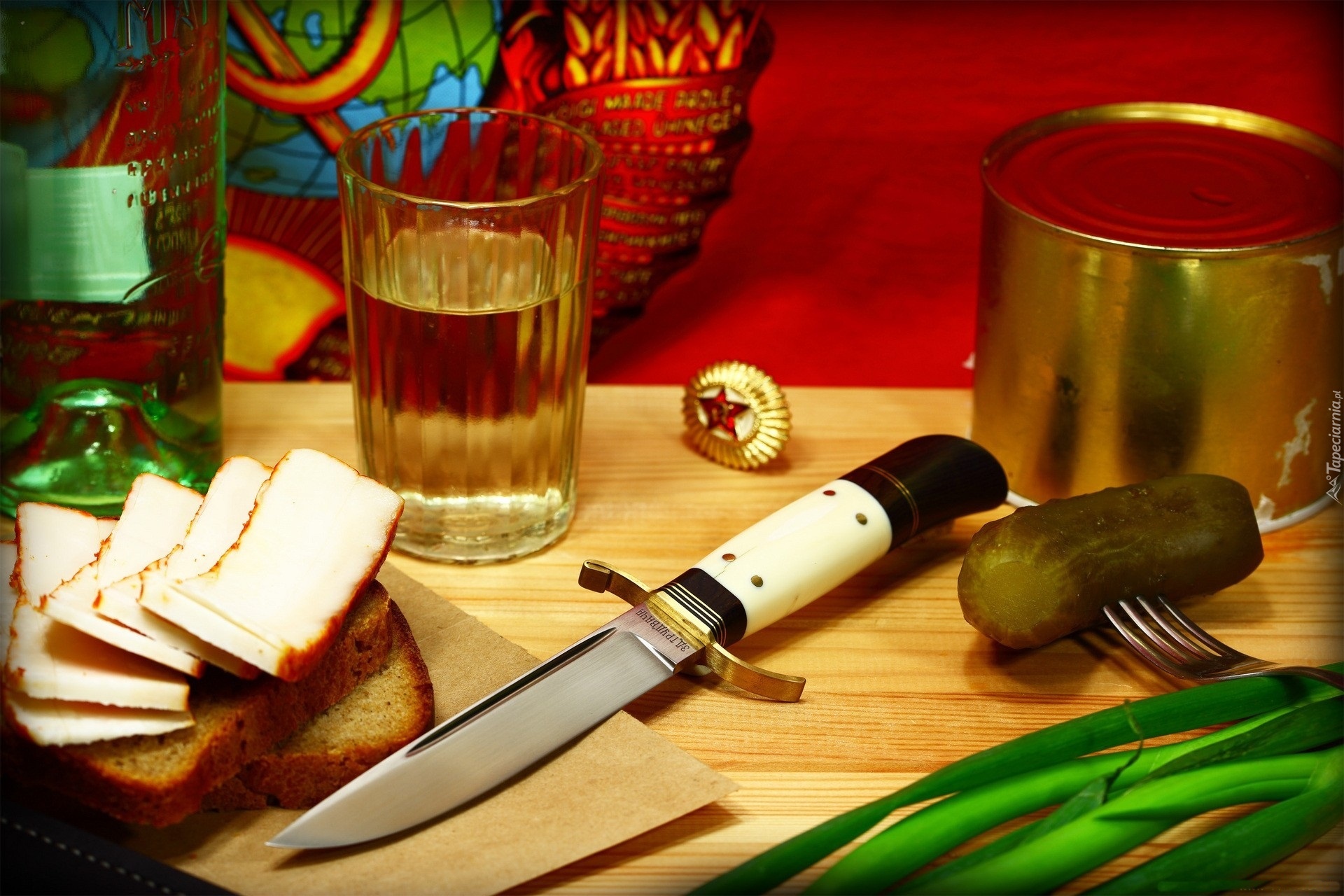 Edytor tapety: Tuszonka, Słonina, Nóż, Alkohol, Szczypior