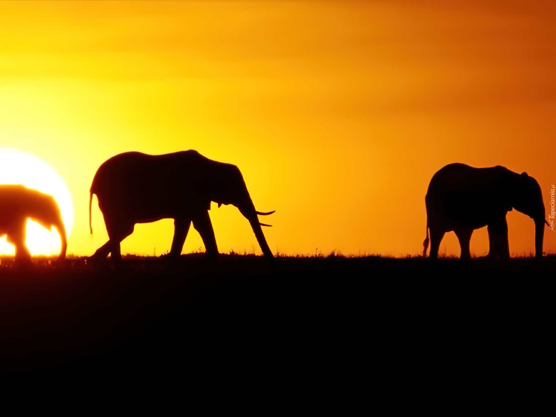 Edytor tapety: Zachód, Słońca, Maszerujące, Słonie