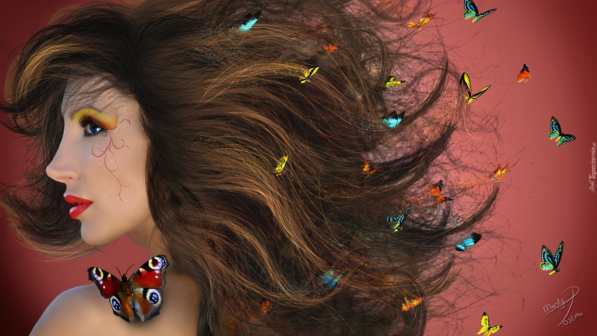 Edytor tapety: Dziewczyna, Motyle, We, Włosach