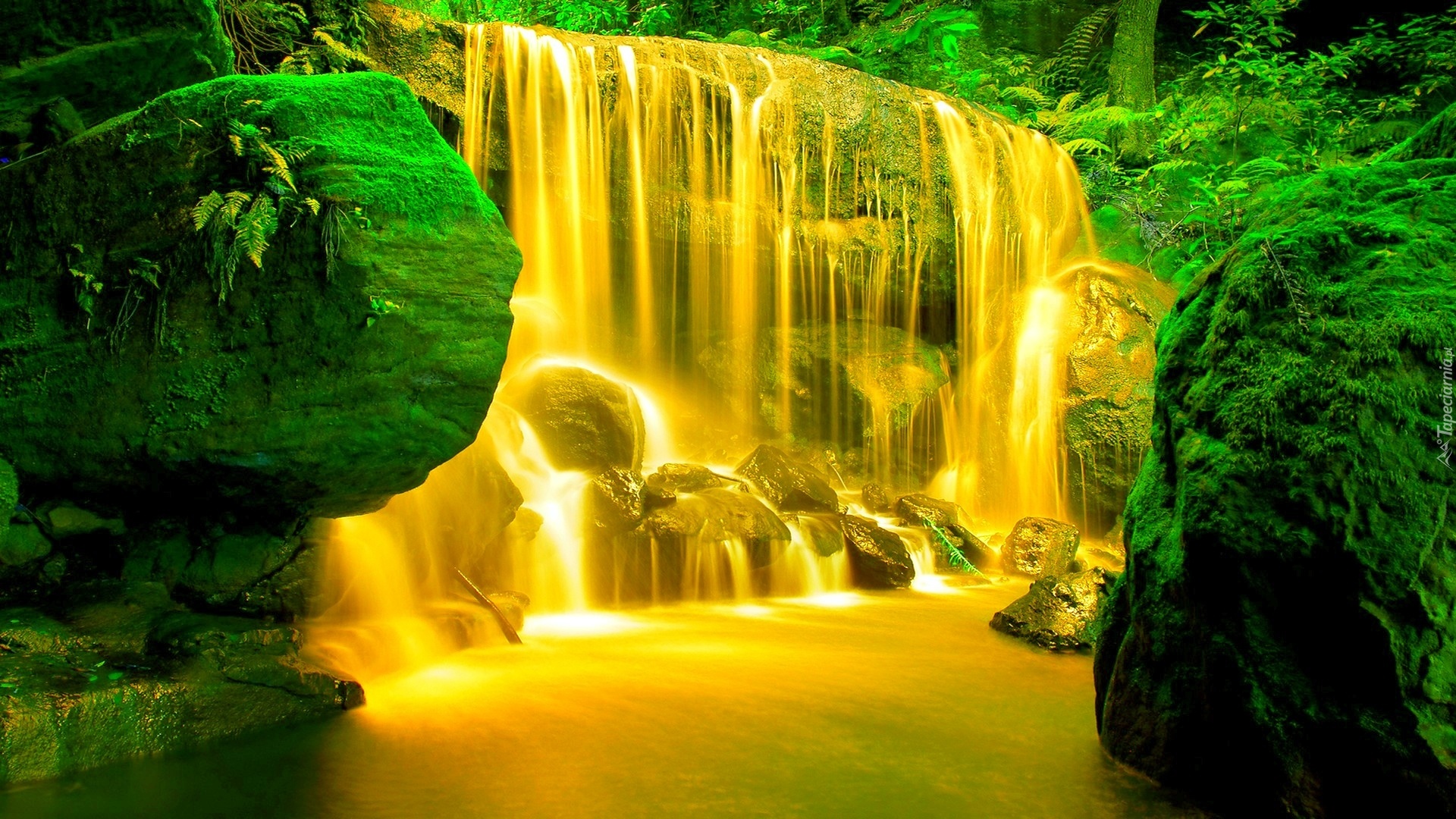 Edytor tapety: Złoty, Wodospad, Zielone, Skały