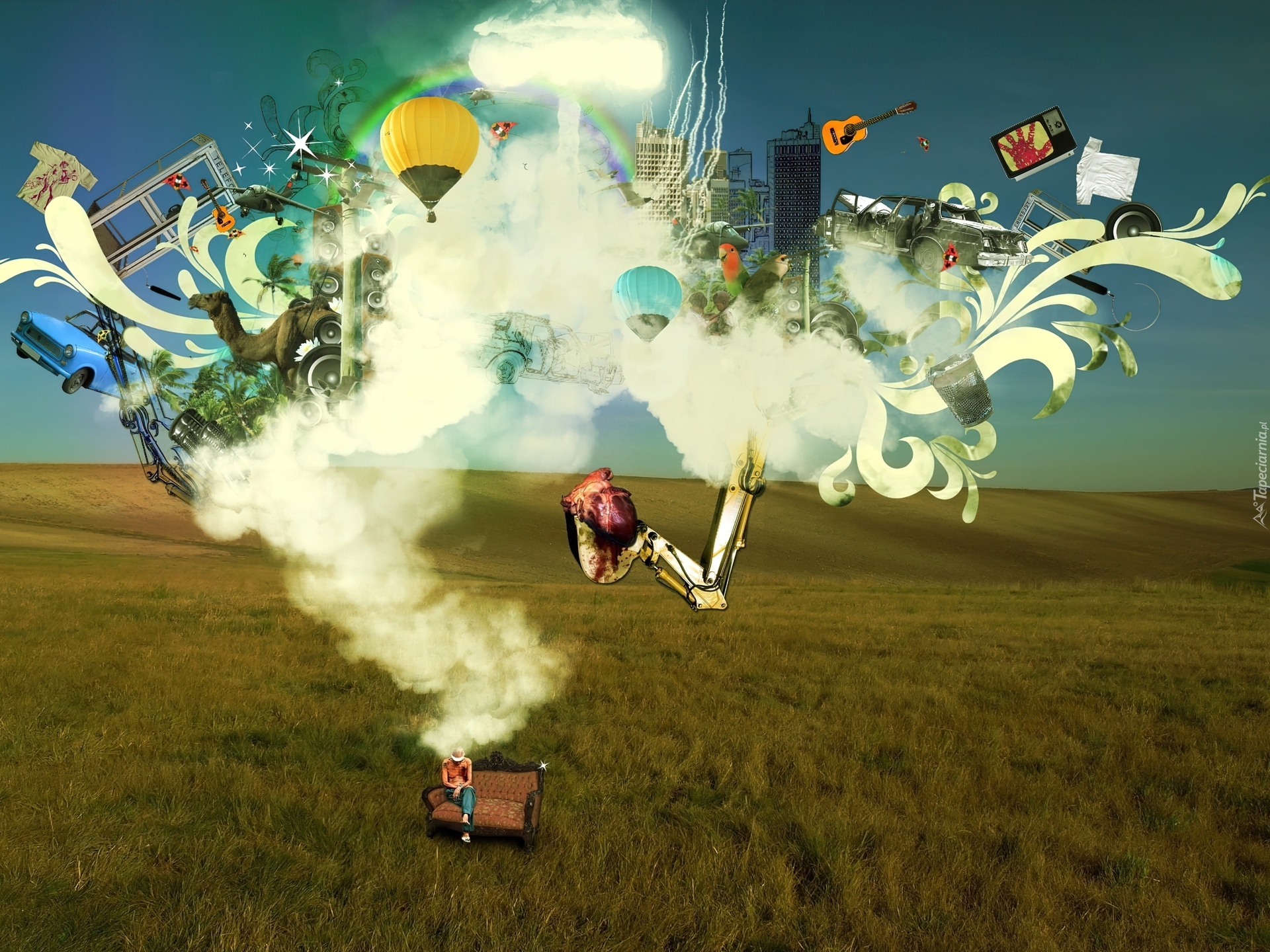 Edytor tapety: Łąka, Kanapa, Człowiek, Dym, Przedmioty