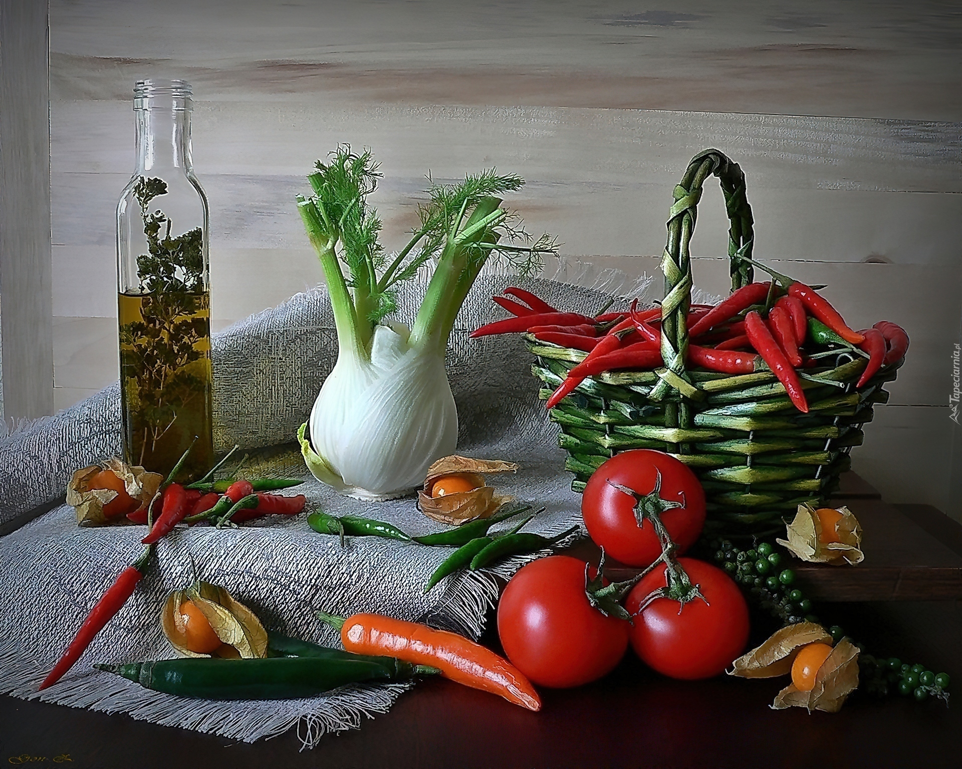 Edytor tapety: Koper, Włoski, Papryczka, Pomidory, Marchewka, Oliwa, Koszyczek