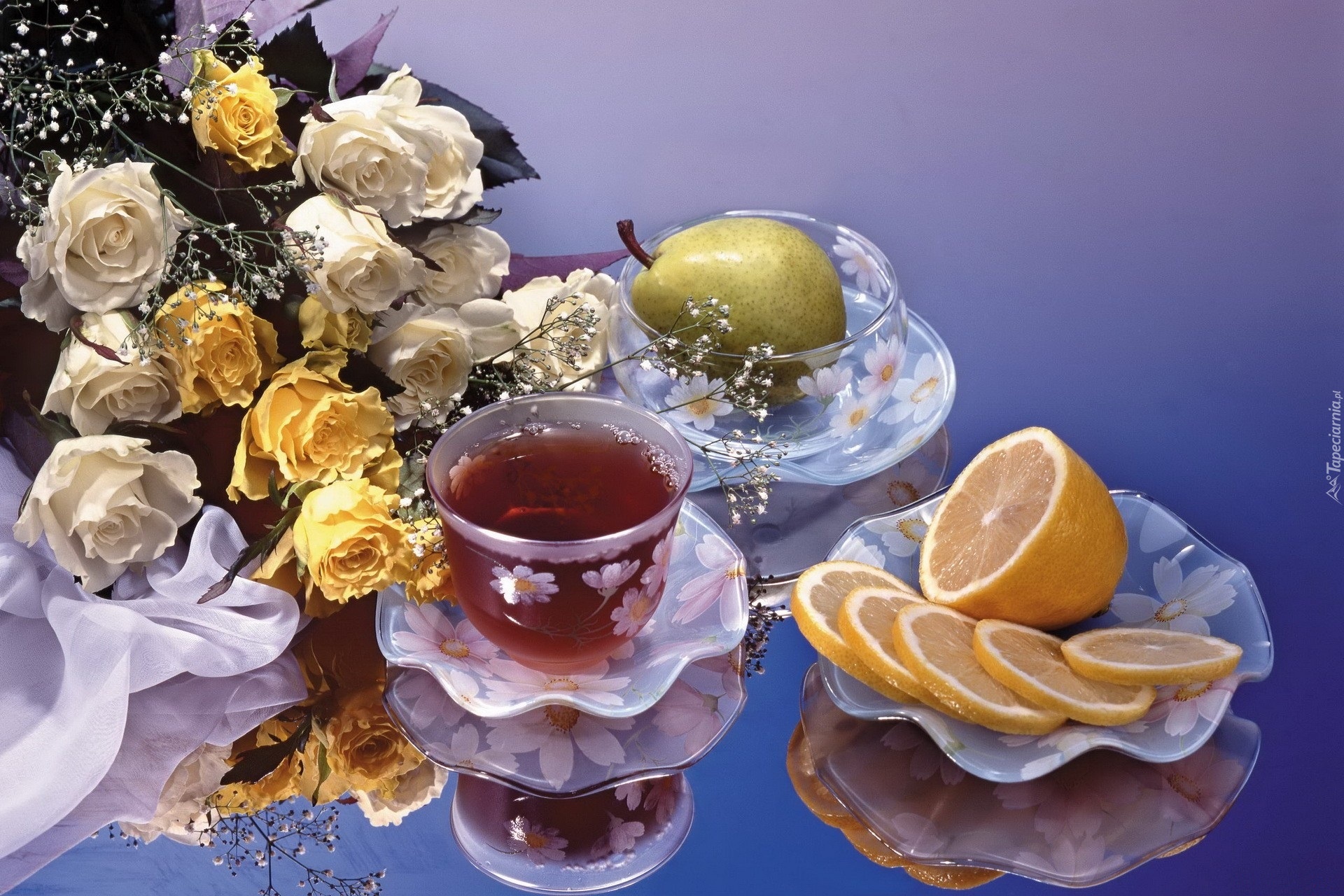 Edytor tapety: Bukiet, Róż, Herbatka, Cytryna, Gruszka