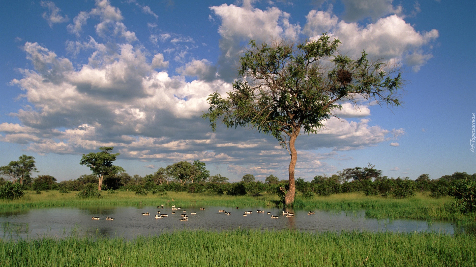 Edytor tapety: Staw, Drzewa, Kaczki, Niebo