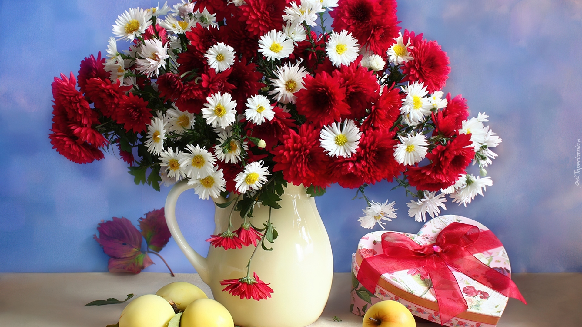 Edytor tapety: Dzbanek, Bukiet, Margerytek, Chryzantem, Jabłuszka