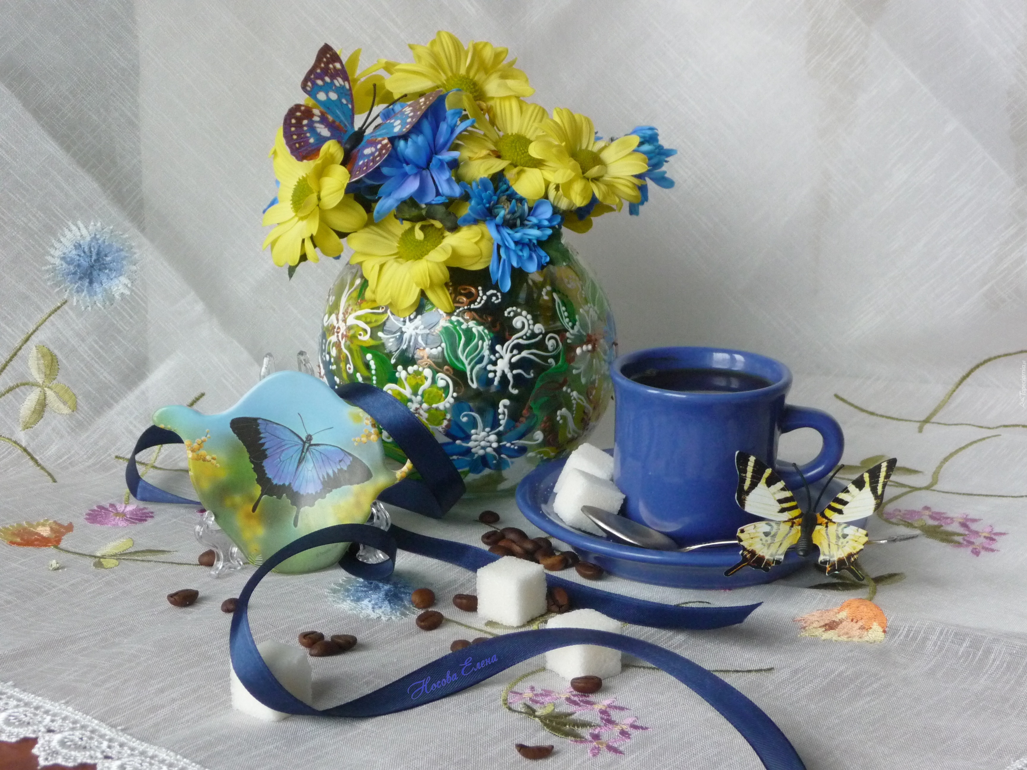 Edytor tapety: Wazonik, Filiżanka, Kostki, Cukru, Bukiecik, Margerytek