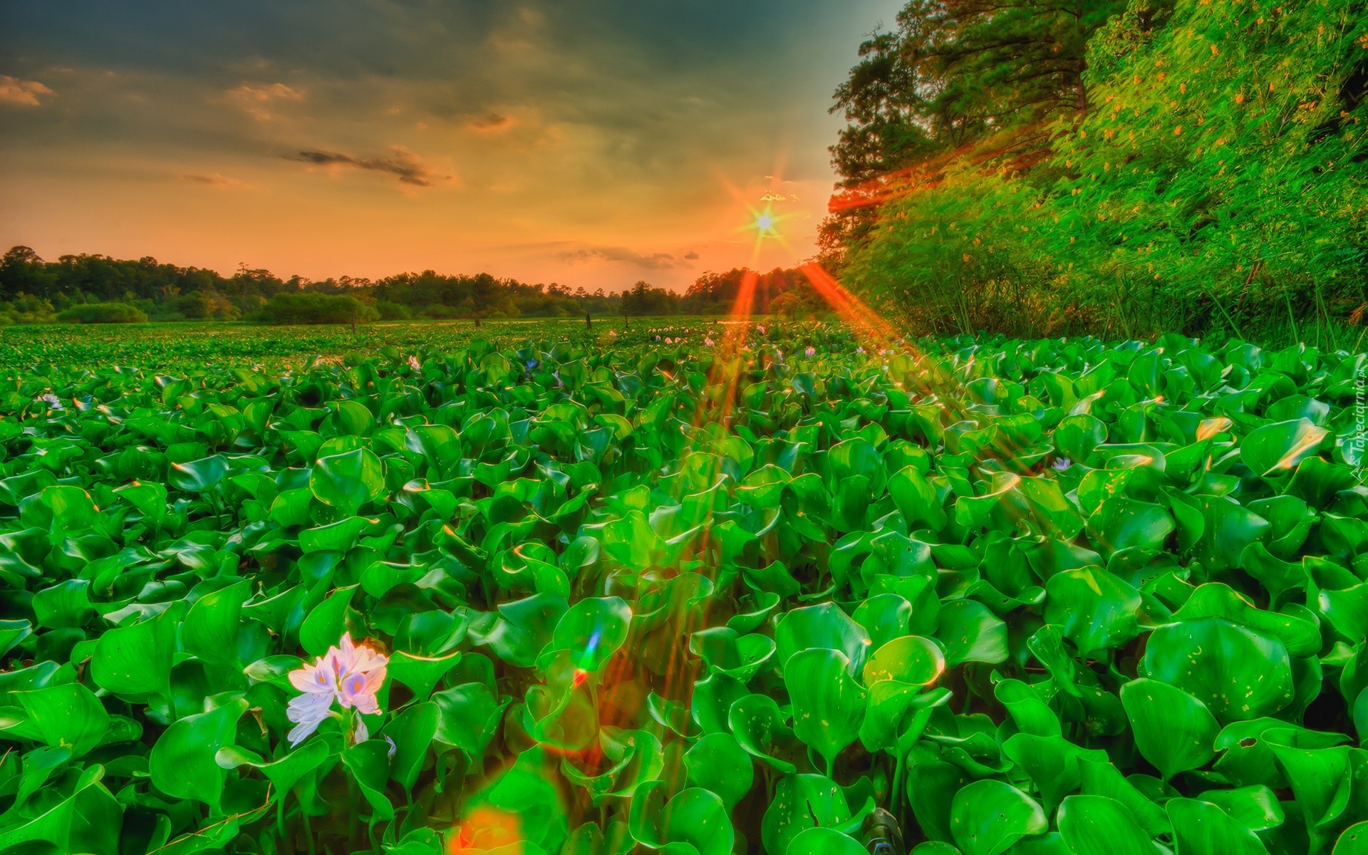 Edytor tapety: Zachód, Słońca, Kwiaty, Promienie, Słońca
