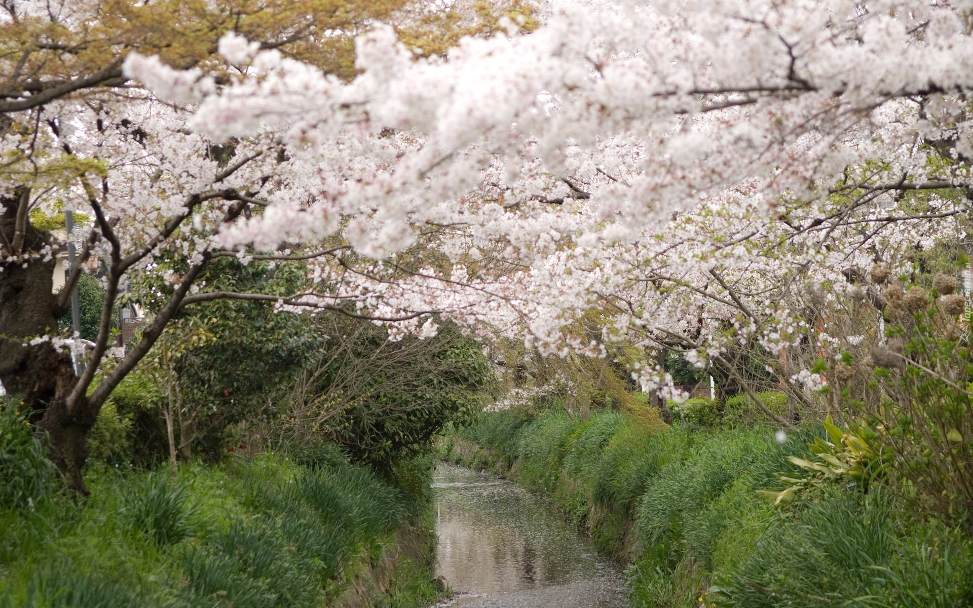 Edytor tapety: Rzeczka, Trawy, Drzewa, Kwiaty