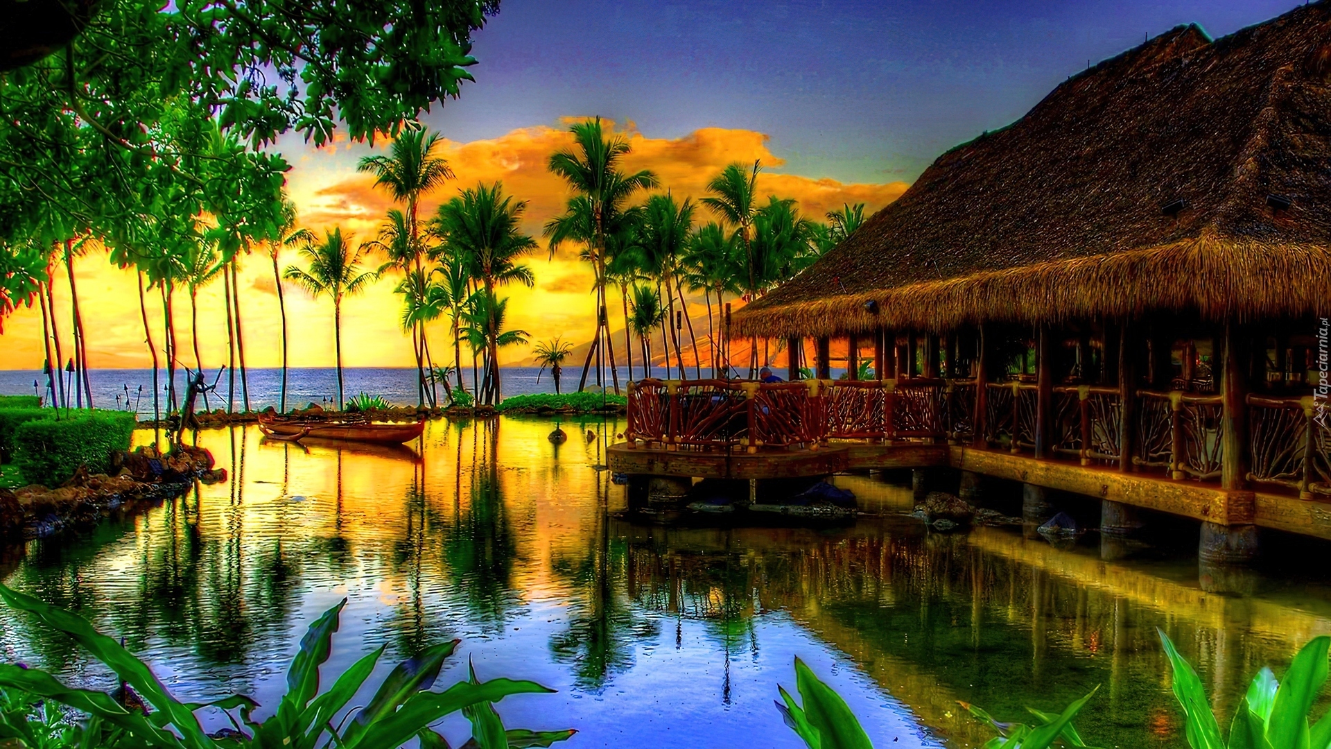 Edytor tapety: Domek, Palmy, Zachód, Słońca