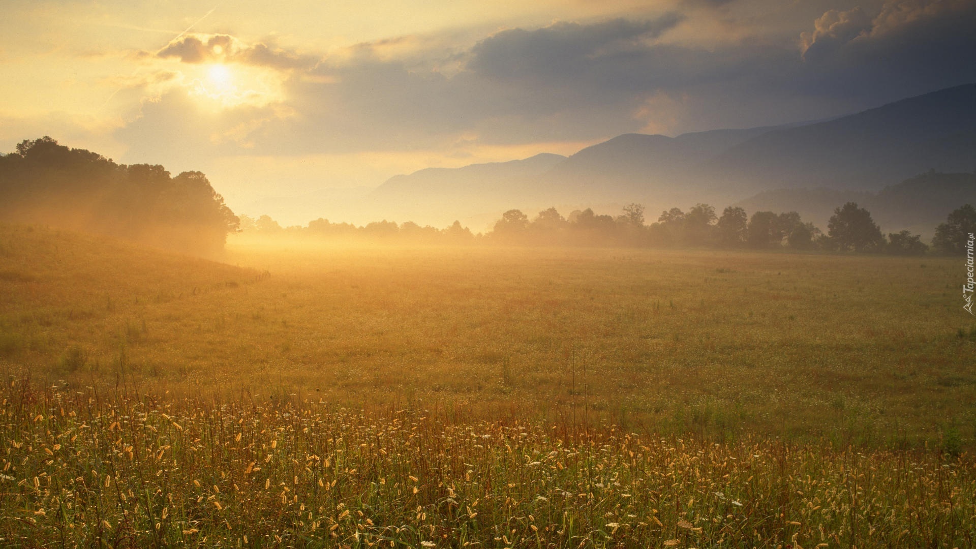Edytor tapety: Słońce, Wschód, Promienie, Las, Łąka