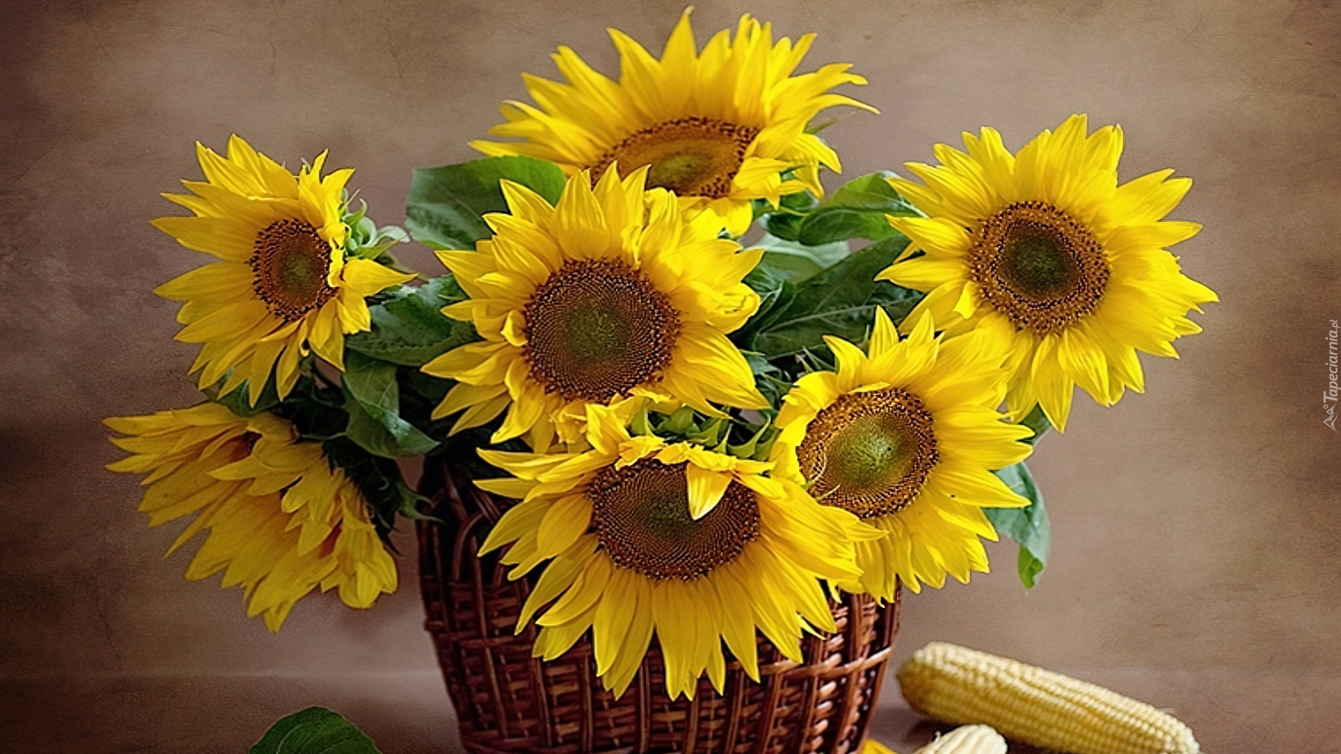 Edytor tapety: Kosz, Słoneczniki, Kukurydza