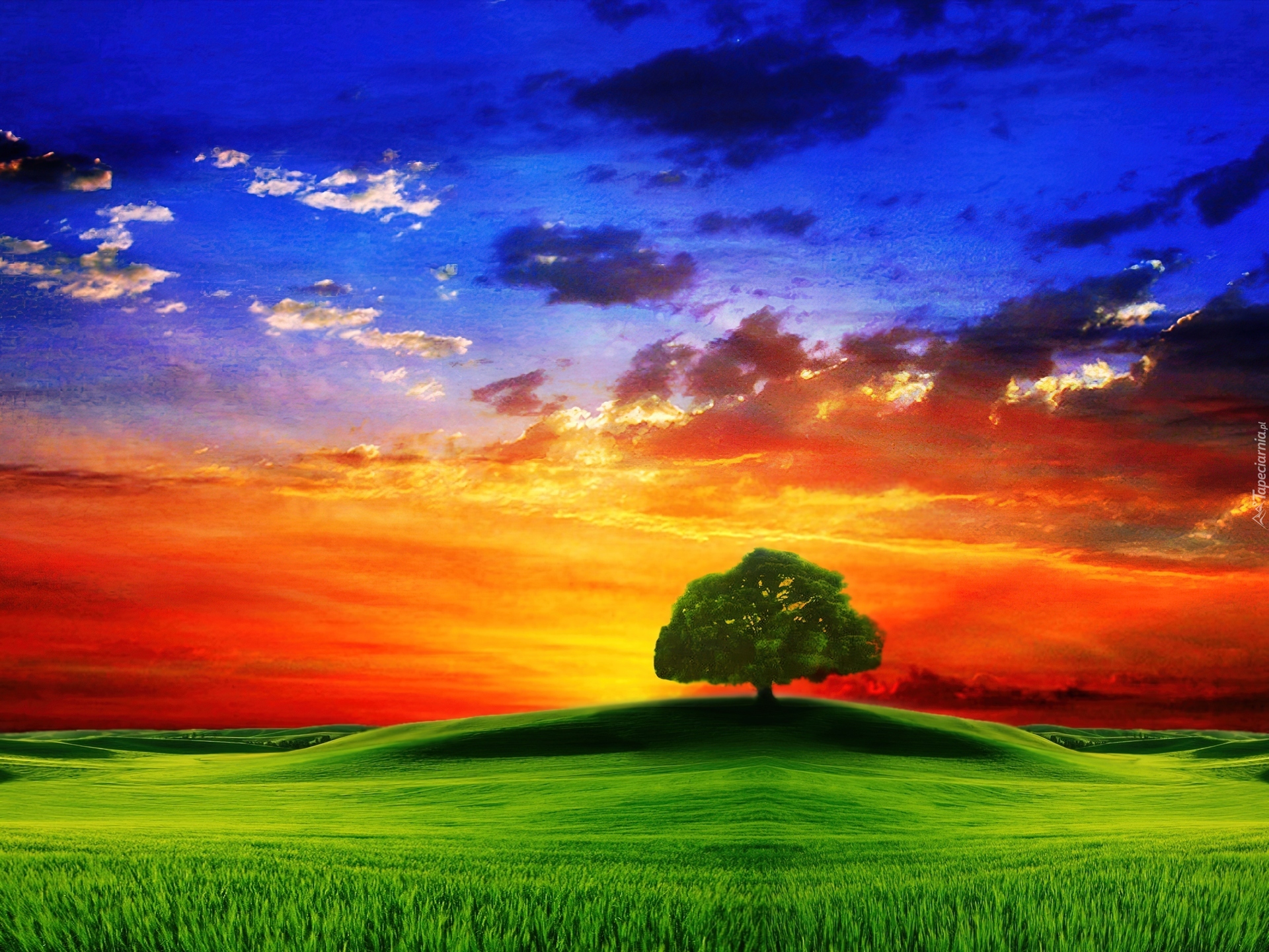 Edytor tapety: Zachód, Słońca, Drzewo, Łąka