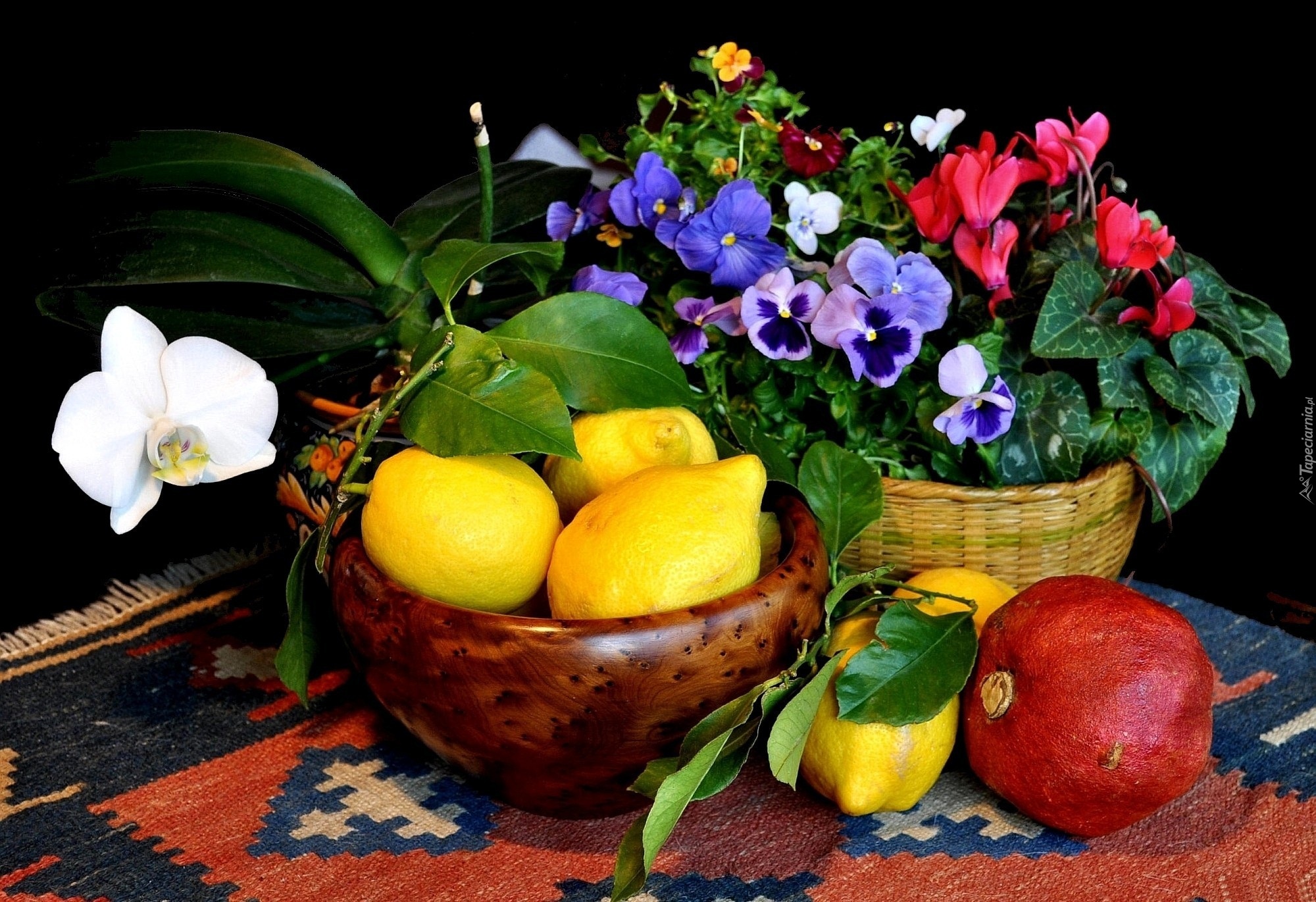 Edytor tapety: Doniczka, Kwiaty, Cytryny, Granat, Owoce, Kompozycja