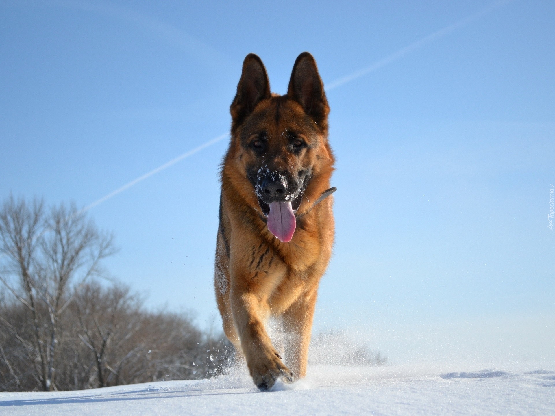 Edytor tapety: Owczarek, Niemiecki, Język, Spacer, Śnieg, Niebo, Drzewa