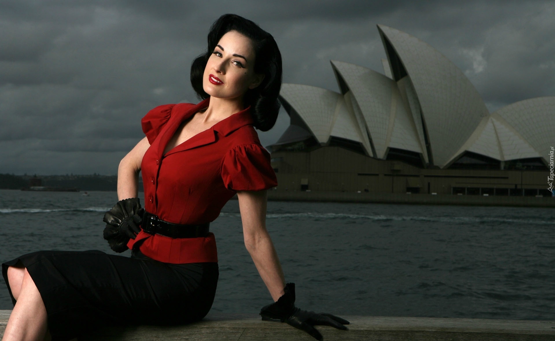 Edytor tapety: Dita Von Teese, Czerwona, Bluzeczka, Rękawiczki