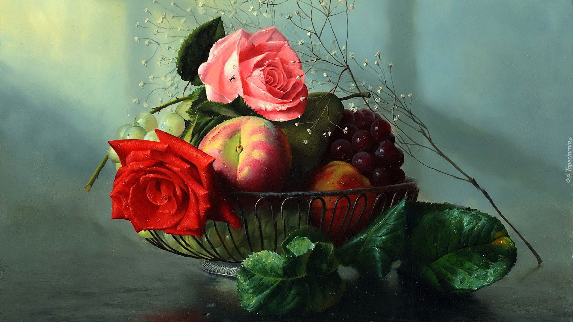 Edytor tapety: Kompozycja, Kwiaty, Róże, Owoce