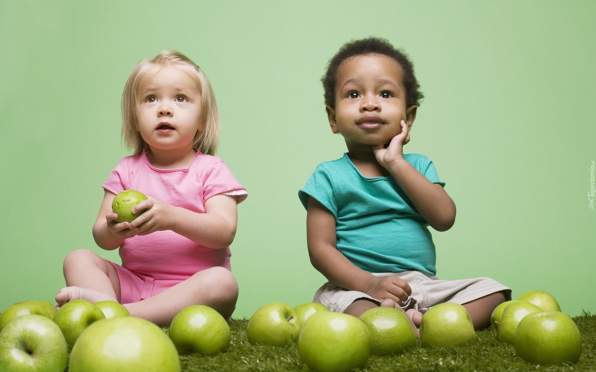 Edytor tapety: Chłopiec, Dziewczynka, Zielone, Jabłka