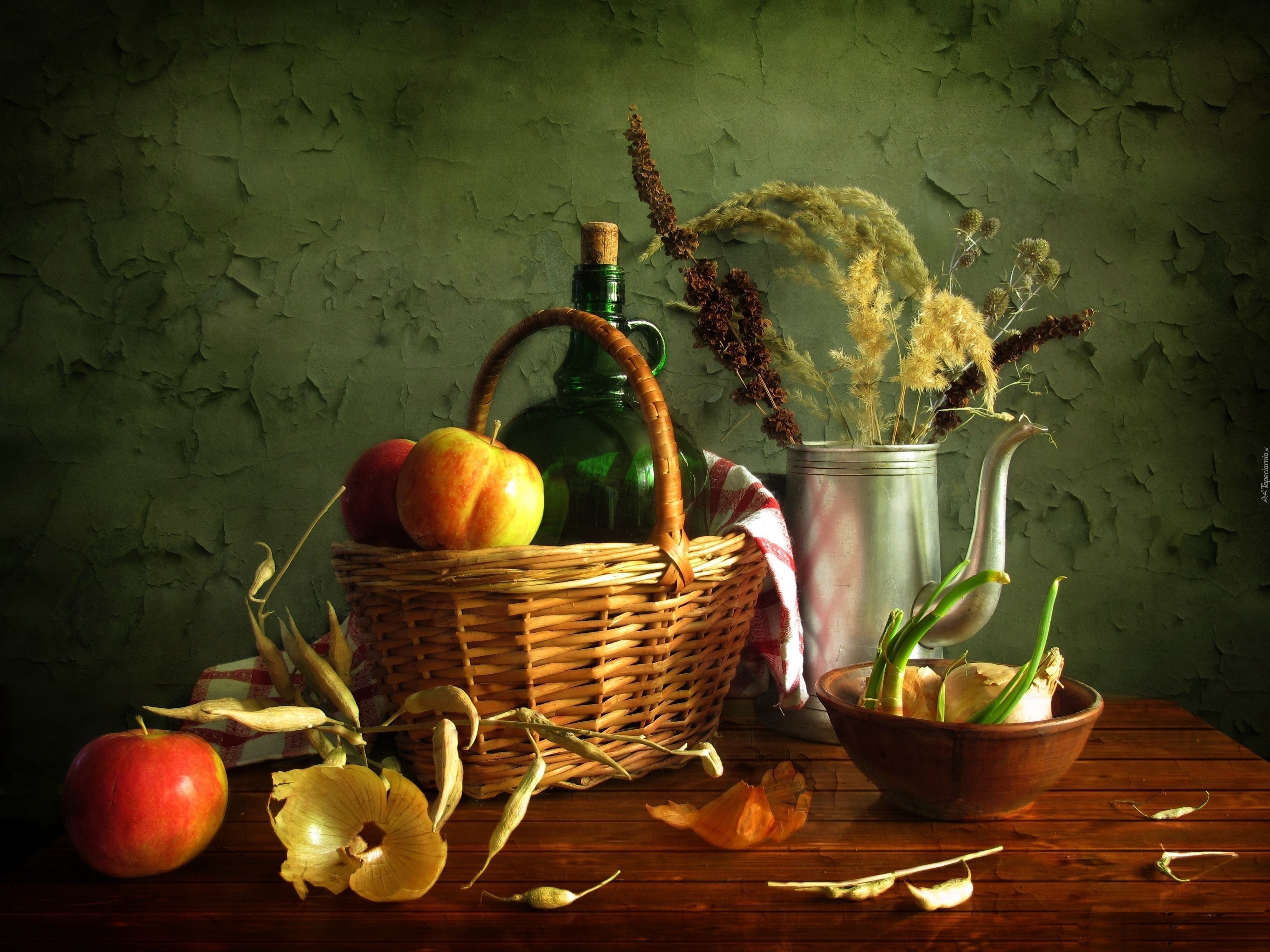 Edytor tapety: Kompozycja, Kosz, Jabłka, Cebula, Butelka