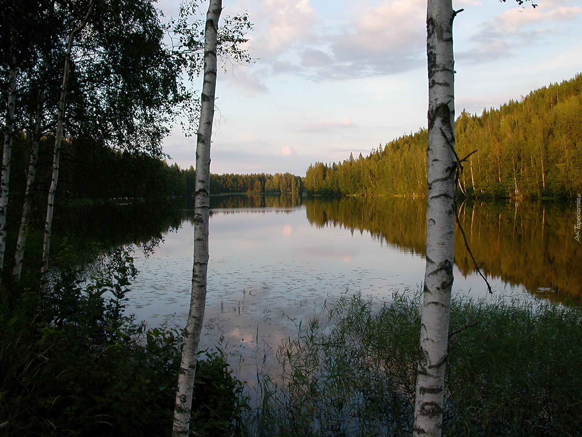 Edytor tapety: Jezioro, Odbicie, Drzewa, Brzozy, Las, Woda