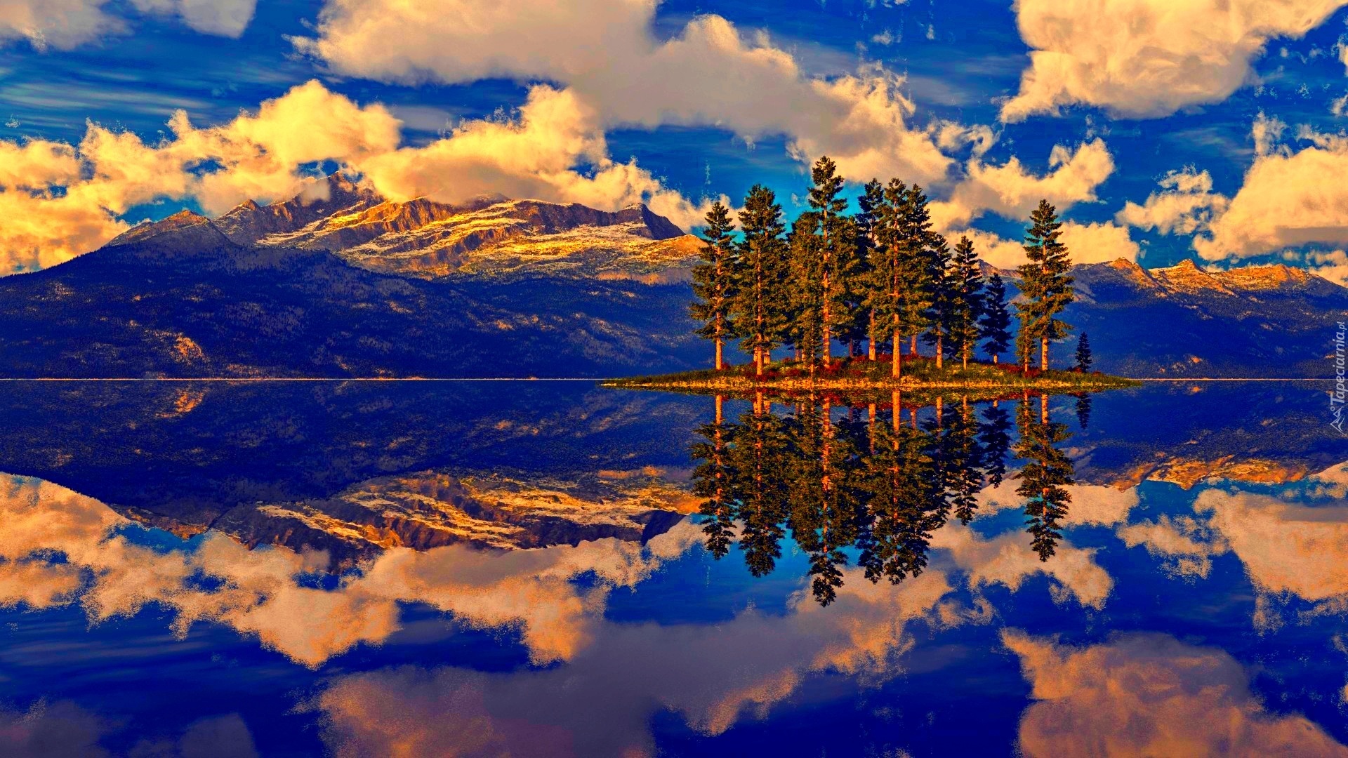 Edytor tapety: Góry, Chmury, Drzewa, Odbicie