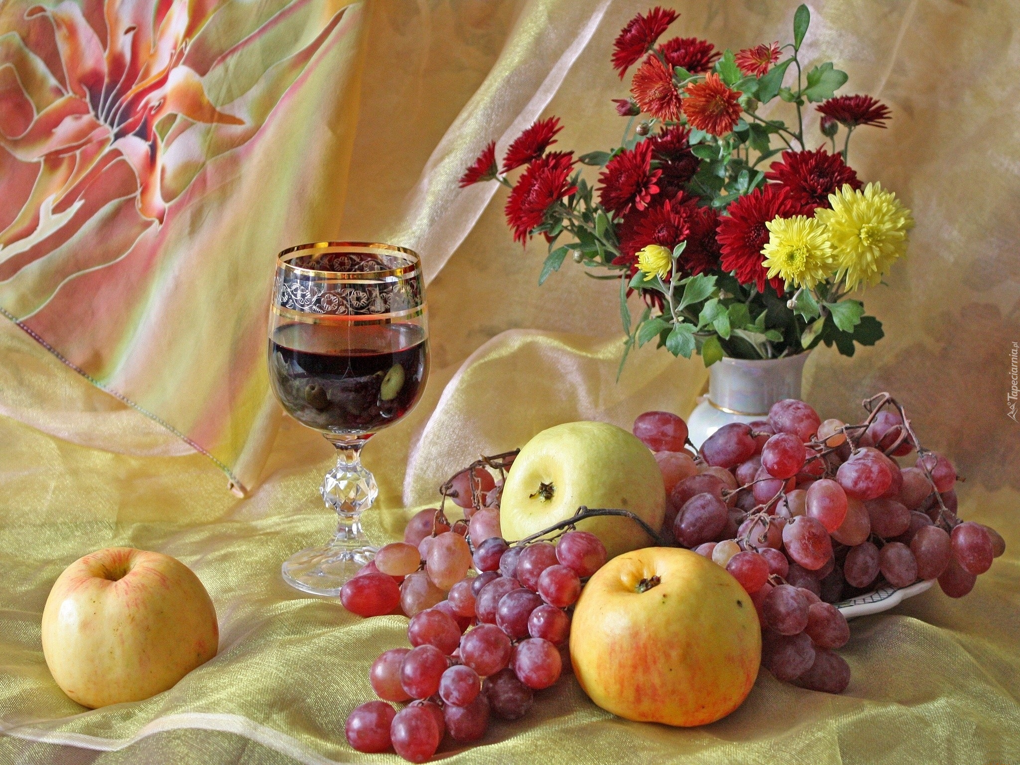 Edytor tapety: Chryzantemy, Winogrona, Jabłka, Kieliszek, Wino, Owoce