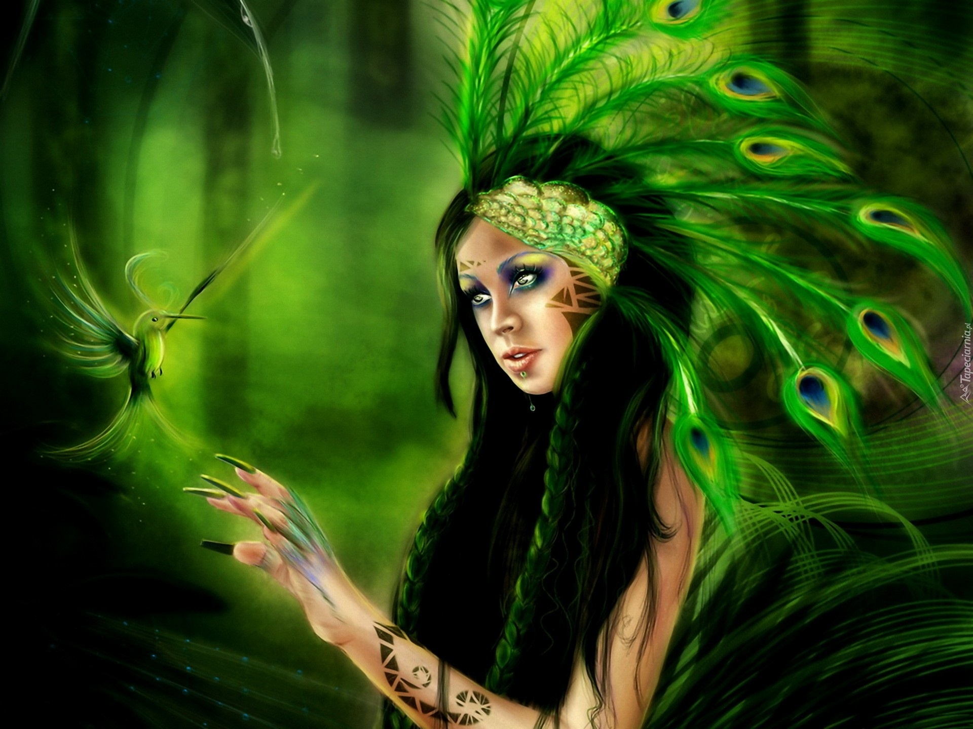Edytor tapety: Dziewczyna, Pawie, Pióra, Ptak