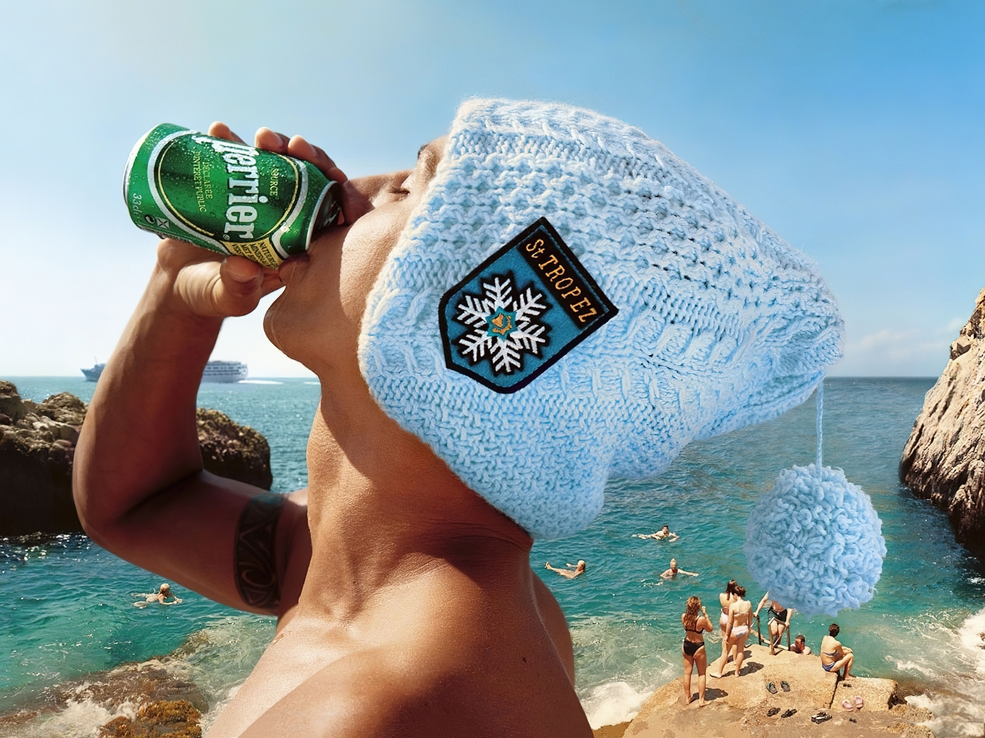 Edytor tapety: Głowa, Czapka, Woda, Perrier