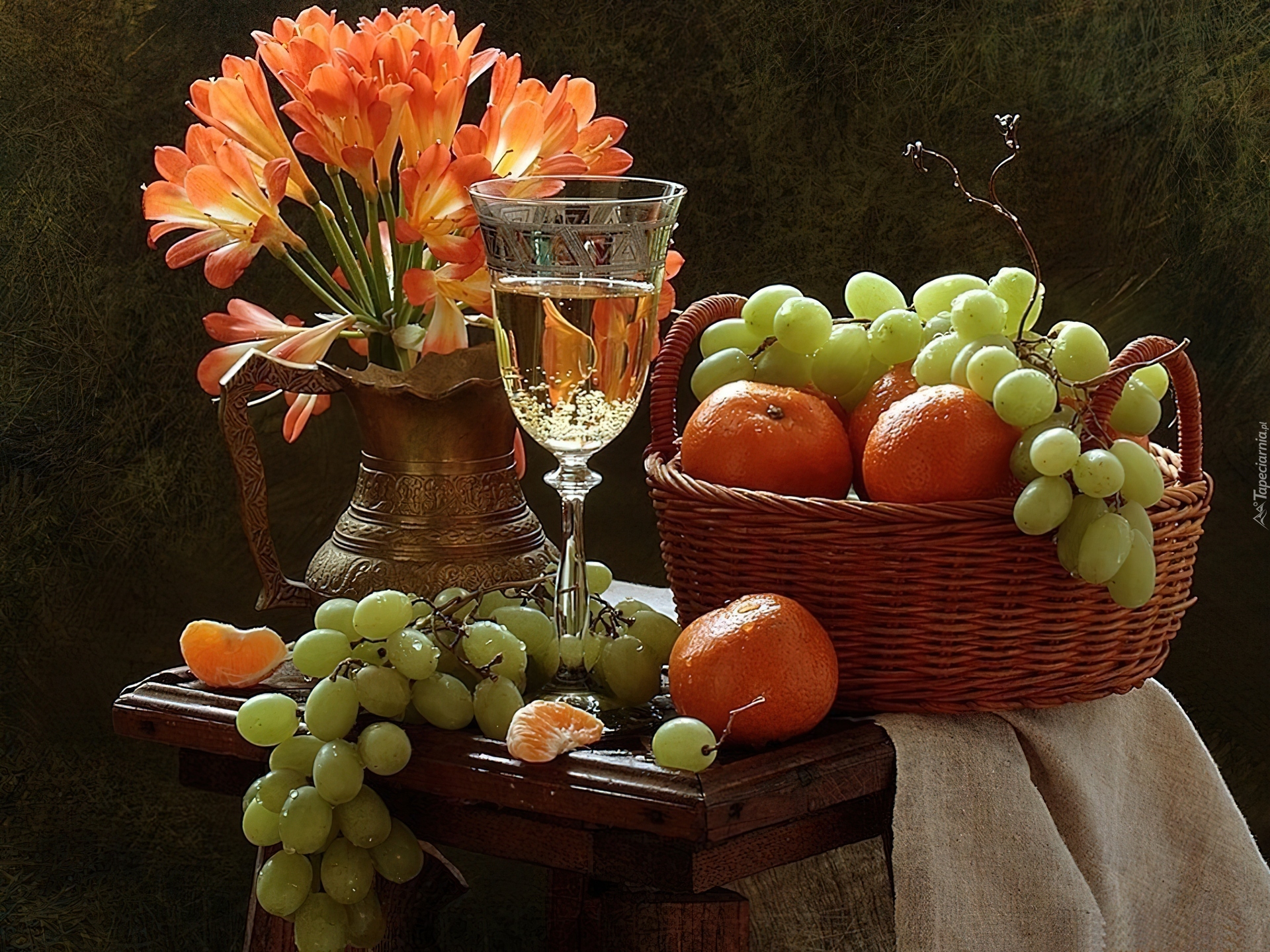 Edytor tapety: Kosz, Owoce, Kwiaty, Kieliszek