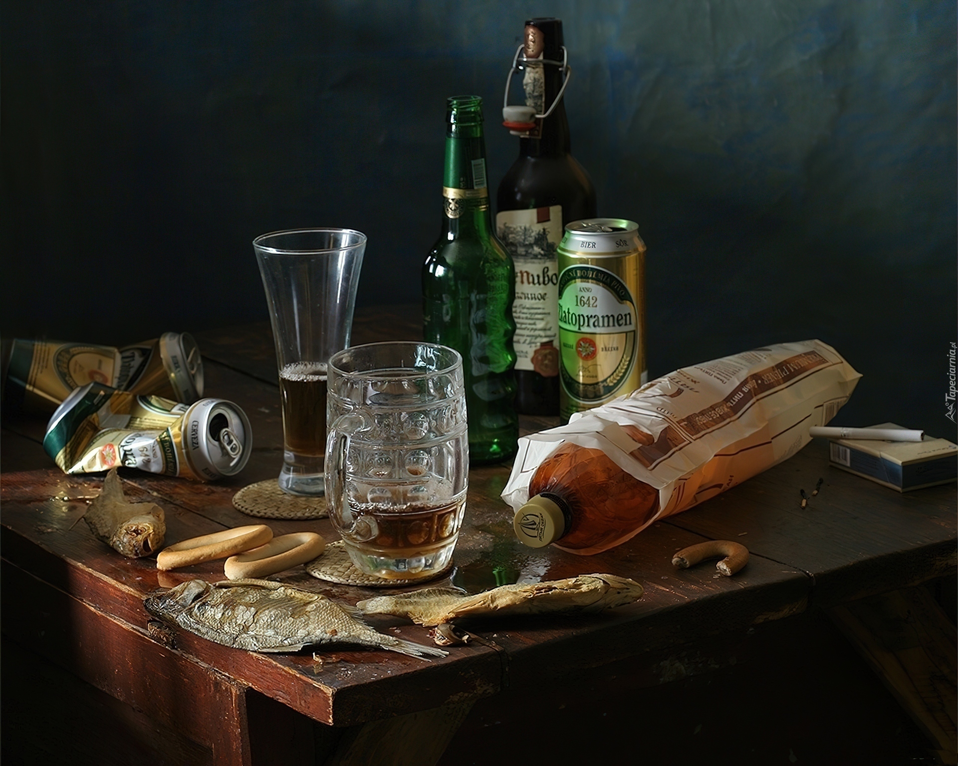 Edytor tapety: Butelki, Alkohol, Puszki, Piwo, Suszone, Ryby