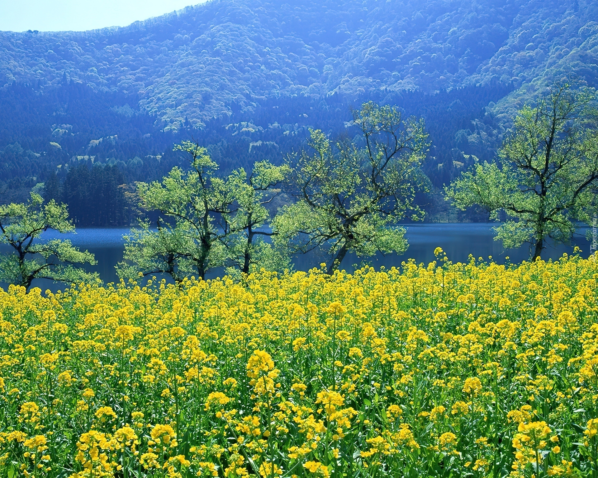 Edytor tapety: Drzewa, Łąka, Kwiatki, Trawa, Jezioro, Góra, Wysokość