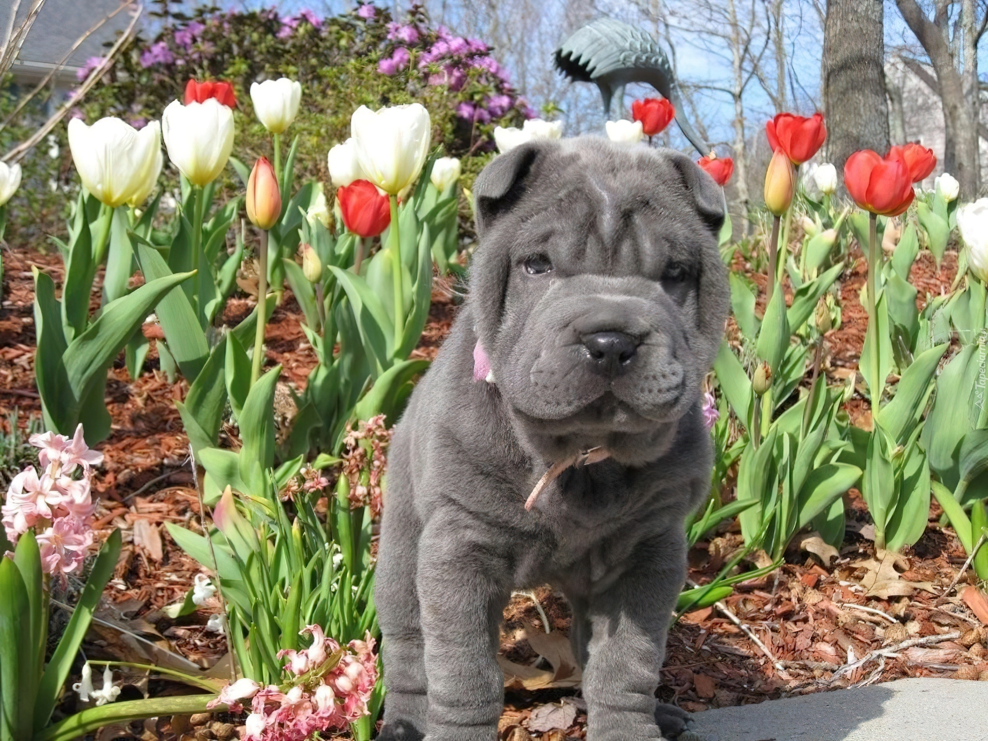 Edytor tapety: Szczeniak, Shar Pei, Tulipany
