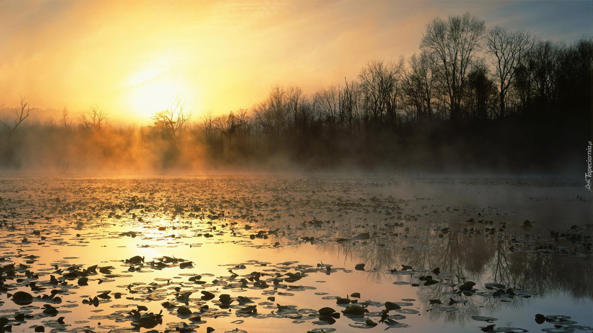 Edytor tapety: Zachód, Słońca, Promienie, Las, Jezioro, Liście