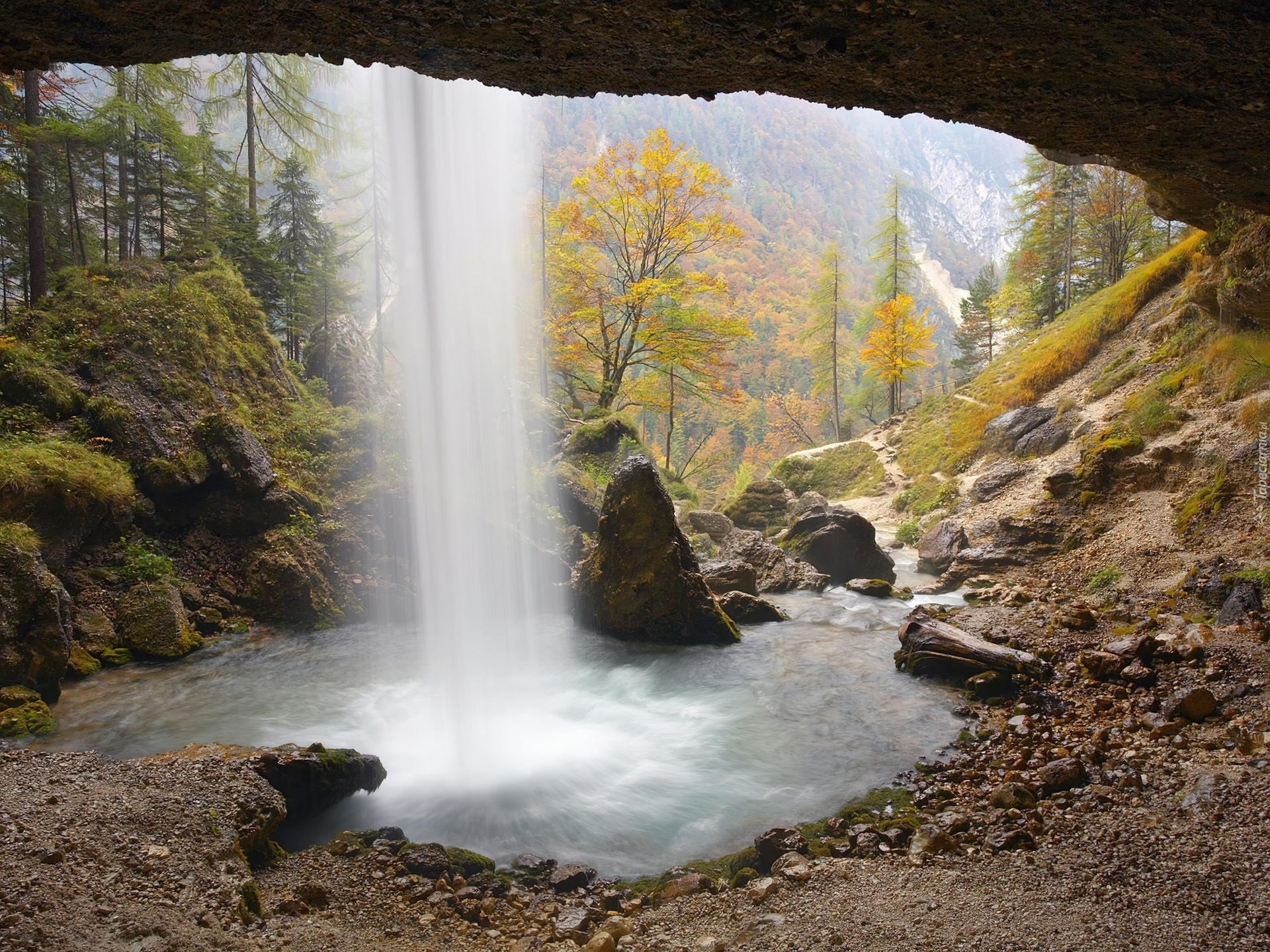 Edytor tapety: Wodospad, Wysokość, Las, Jaskinia, Skały, Kamienie