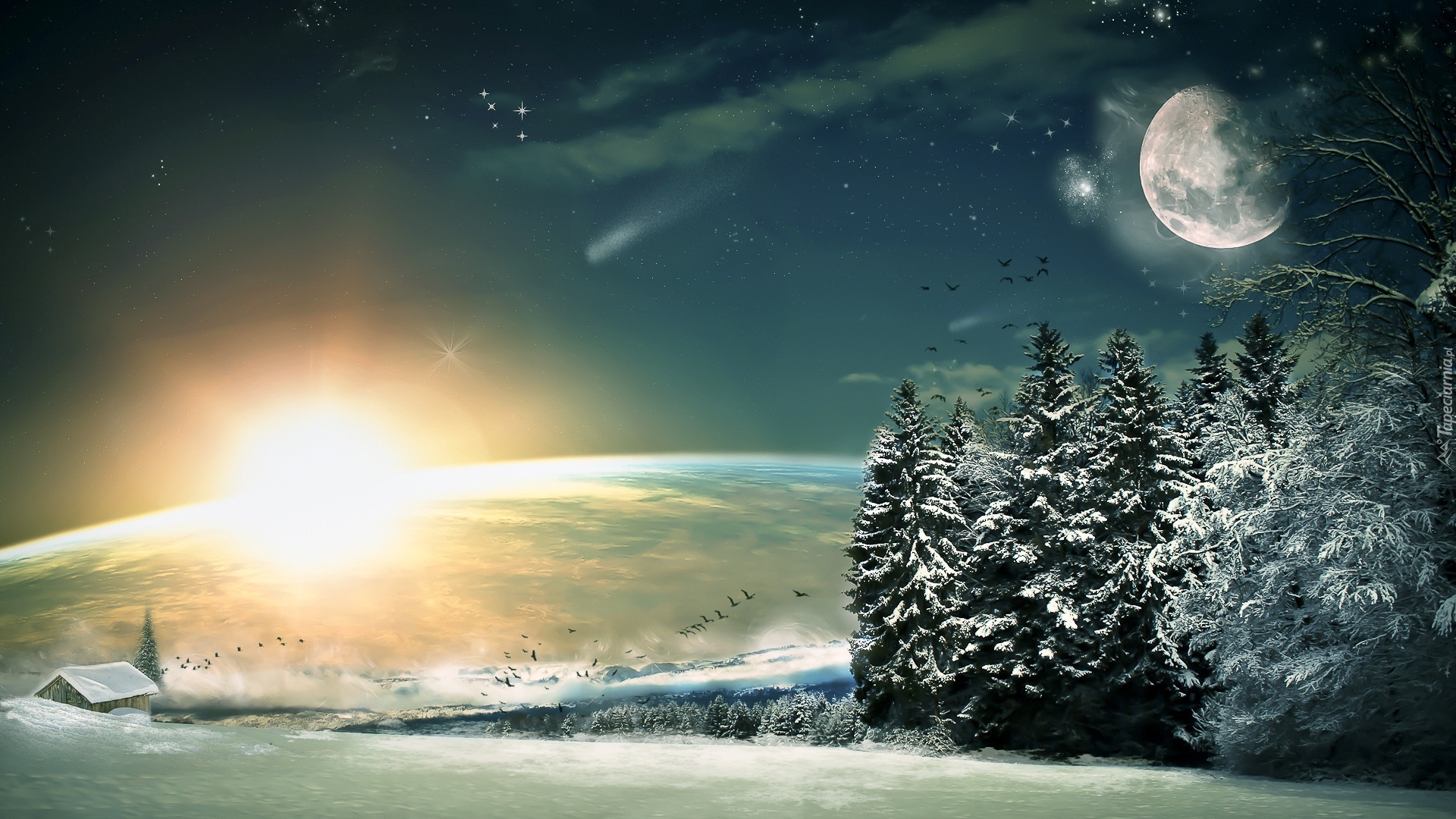 Edytor tapety: Wschodzące, Słońce, Księżyc, Zimowy, Krajobraz