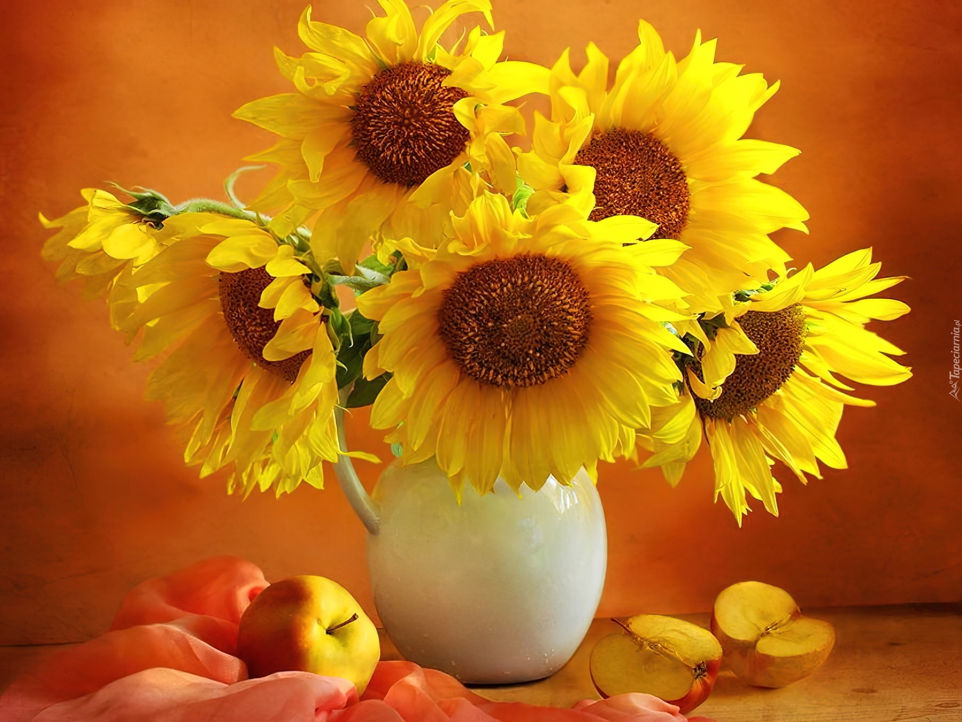Edytor tapety: Dzbanek, Słoneczniki, Jabłka