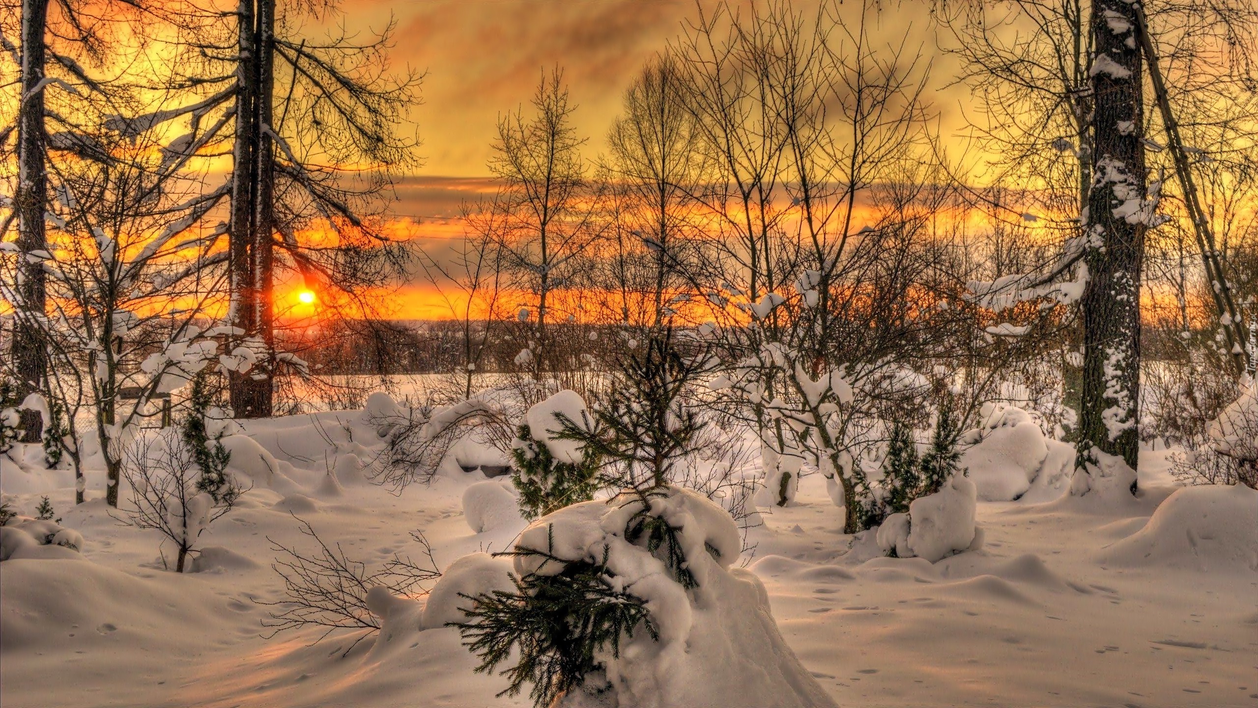 Edytor tapety: Zima, Drzewa, Zachód, Słońca